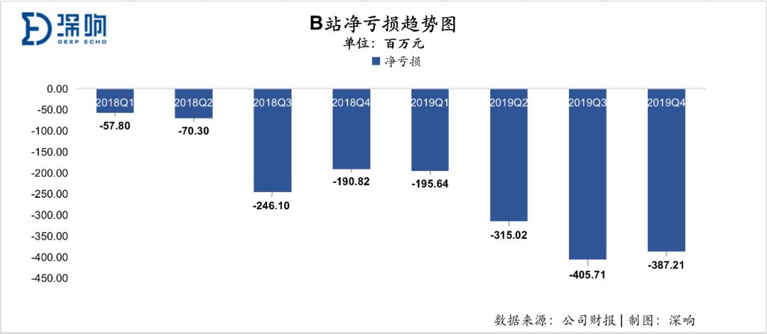 但同时B站在当下还是未能摆脱亏损。2019财年B站净亏损为12.88亿元,同比扩大107.74%,其中第四季度净亏损为3.87亿元,与去年相比亏损扩大103%,不过与第三季度的4.06亿元相比,亏损小幅收窄。