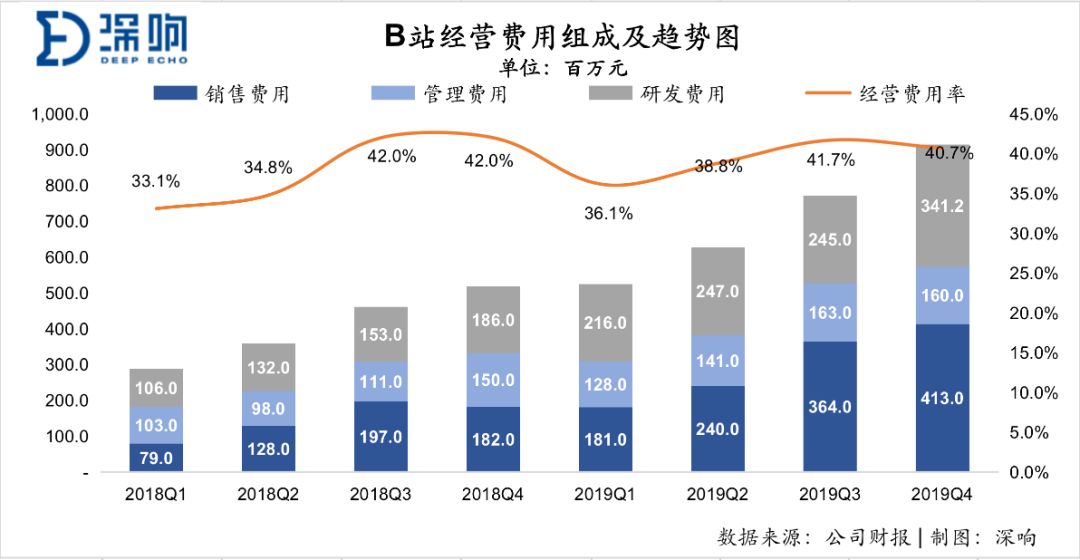 在2019年第二季度财报电话会议上,B站COO李旎设定的目标是MAU要在三年内(到2021 年)达到2.2亿。在这一目标下,B站势必会增强市场、品牌和渠道的投入,因此成本和费用也会有所变化。