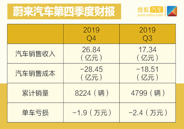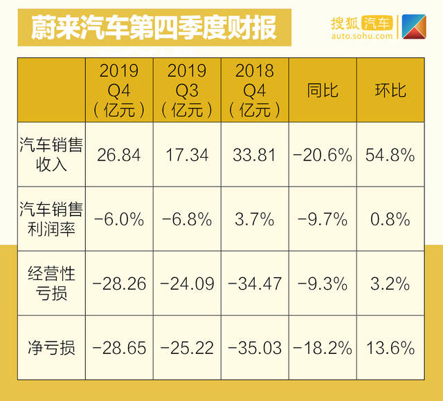 根据蔚来汽车财报显示,2019年第四季度,公司净亏损达28.65亿元,环比上升13.6%,同比下降18.2%。虽然第三季度蔚来汽车在亏损方面收窄,财报表现变好,但第四季度公司没保持住良好的势头,净亏损增大。