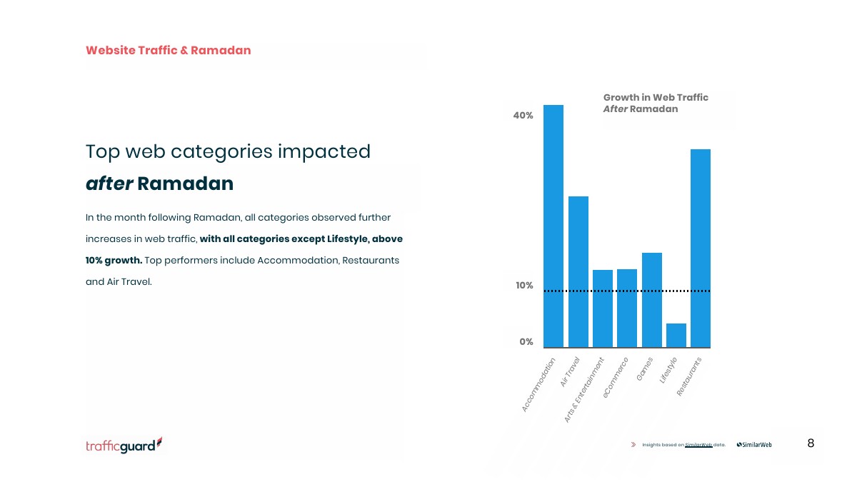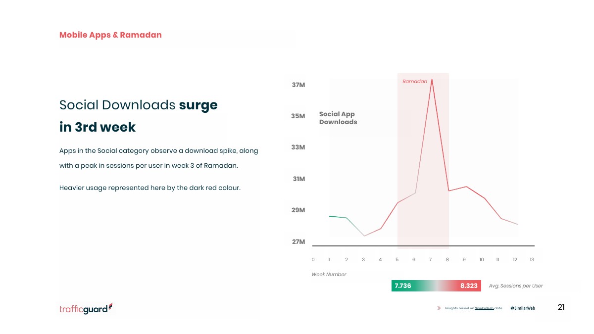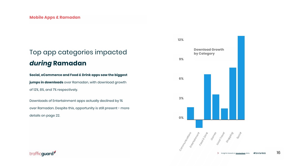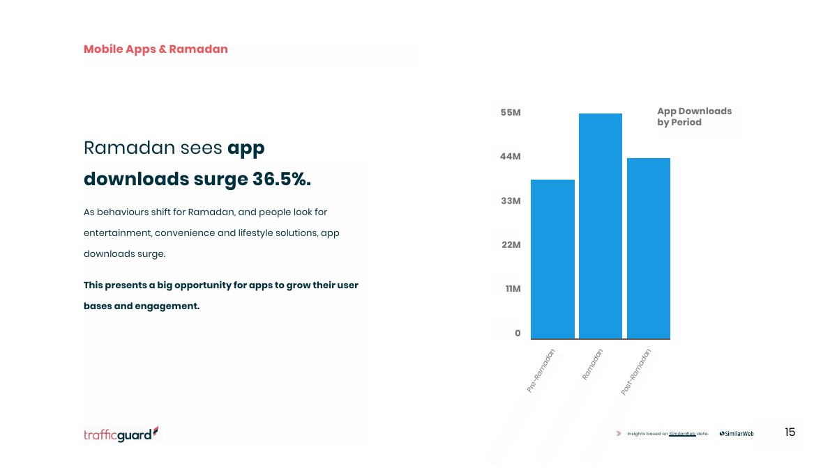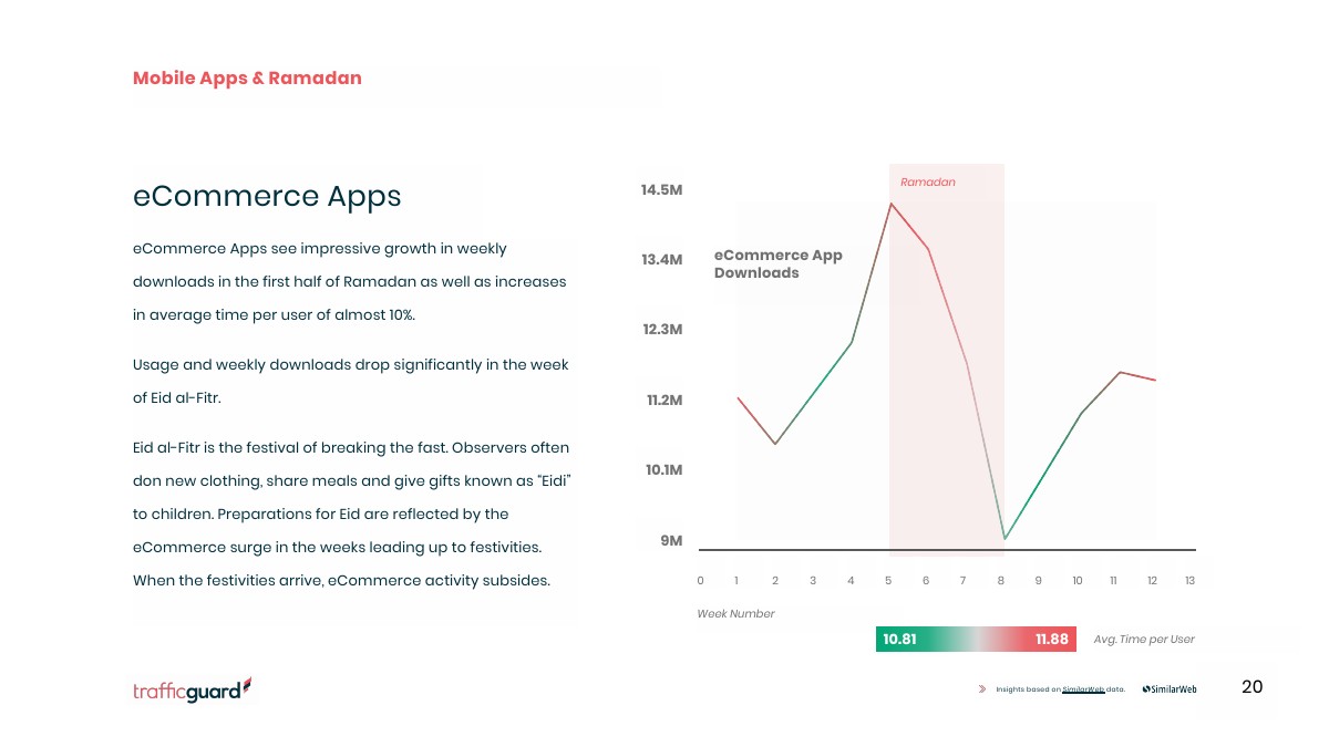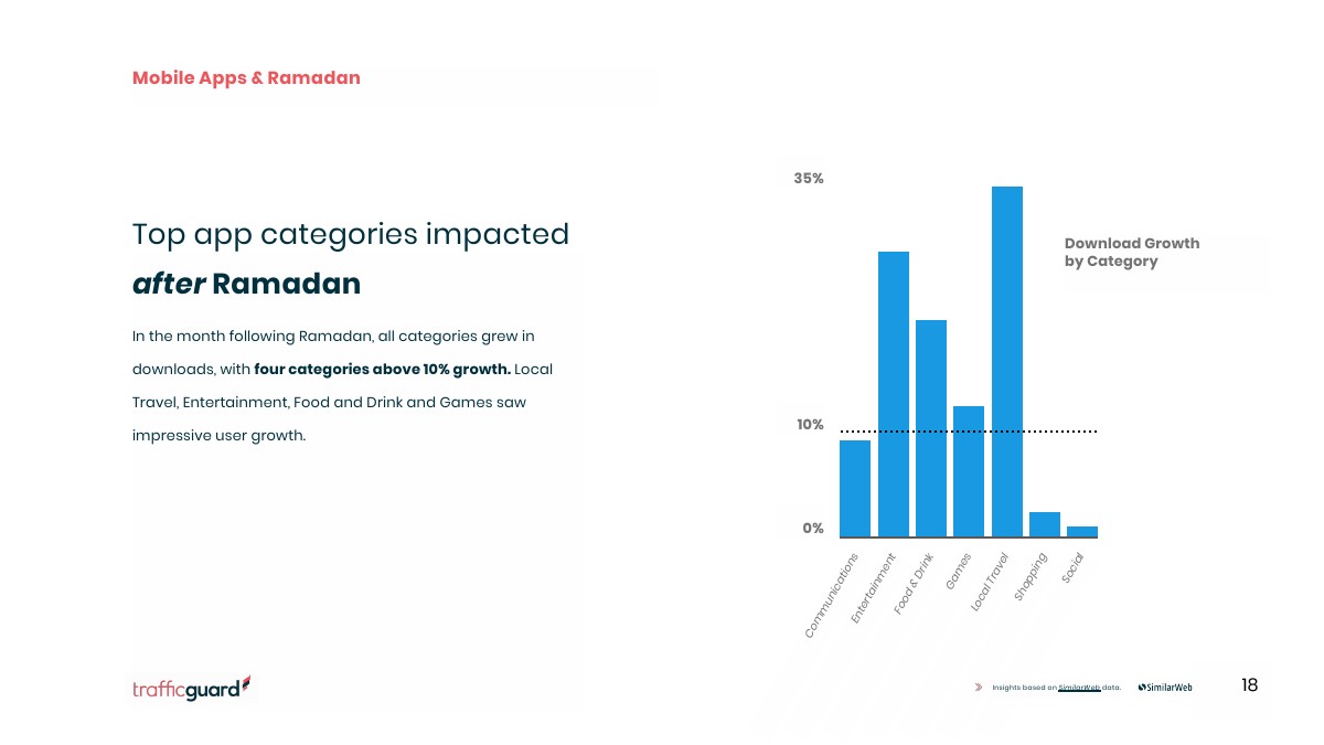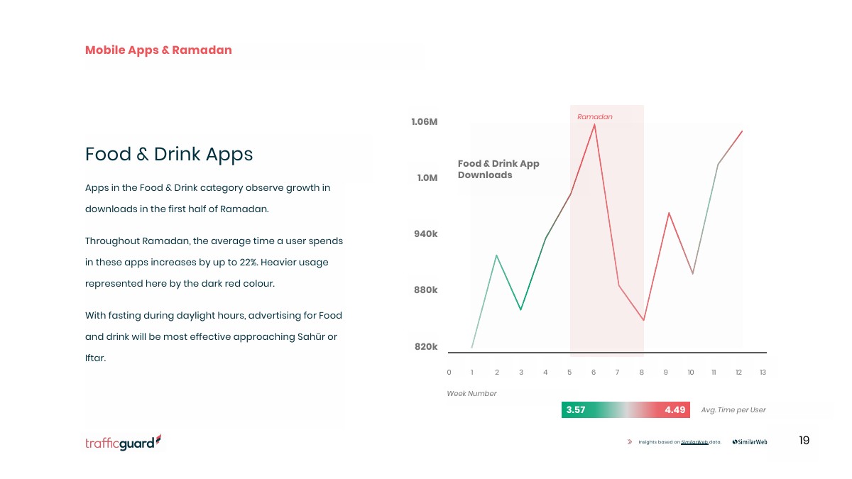 也就是说,虽然开斋节后花在应用上的时间减少了,但斋月后的四周,食品和饮料应用类别的下载量又增加了21%。这种热情反映在整个网络流量上。