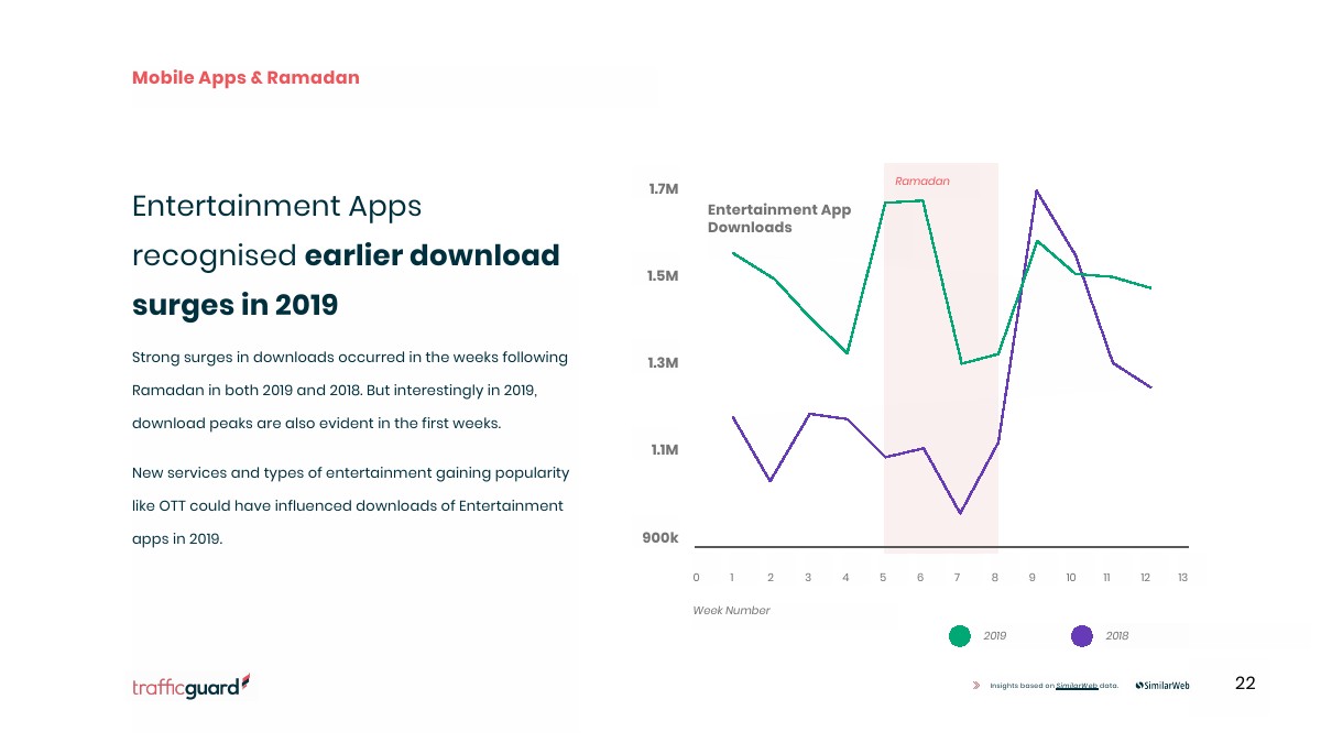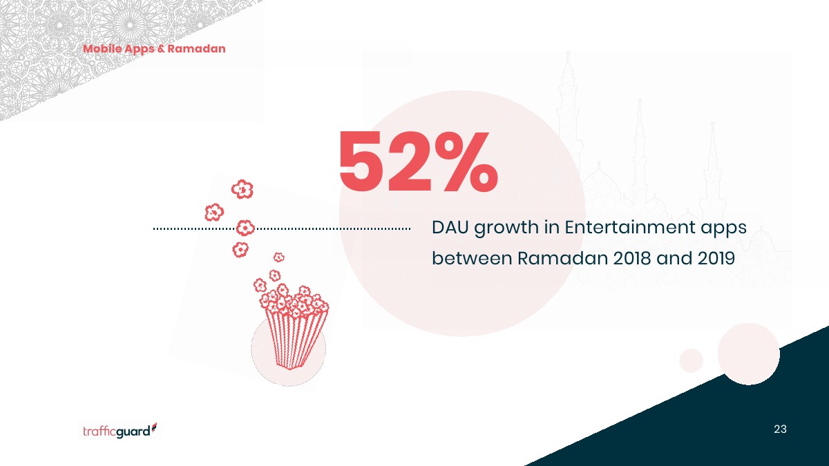 紧随其后的是开斋节当周和开斋节之后的另一次大幅增长,当时娱乐和游戏应用分别经历了28%和13%的增长。