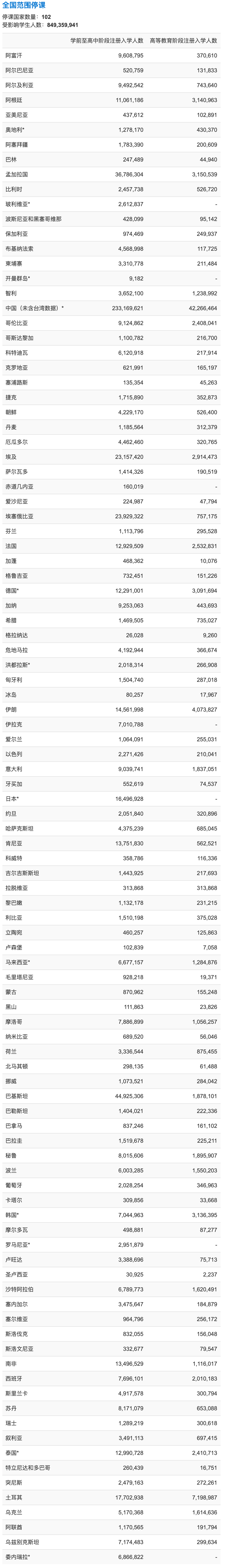 联合国教科文组织:新冠病毒导致全球8.5亿儿童和青少年停课 人数占全球总学生数的一半 因为新冠肺炎(link is external)的传播,无法上学的儿童和青少年人数持续攀升。目前已经有119国宣布或实施了学校停课措施以减缓疫情的全球蔓延。 迄今为止已有107国实施了全国停课,导致从学前到高中阶段的8.5亿儿童和青少年无法继续学业。此外,还有12国实施了局部停课,以预防或遏制新冠肺炎疫情。若这些国家也实行全国停课,无法上学的儿童和青年人数还将增加数千万。 更多阅读:联合国教科文组织:扭转教师短缺成全球当务之急联合国教科文组织:2024年教育财政观察报告:屏幕的背后联合国教科文组织:2022年全球教育危机报告联合国教科文组织:预计2020年中国电影票房收入达到128亿美元联合国教科文组织:Covid-19对学校和学习成绩的影响报告联合国教科文组织:2022年世界遗产地冰川报告联合国教科文组织:2022年世界水发展报告Accessnow:自2016年1月以来印度已断网54次联合国教科文组织:重塑创意政策报告(313页)联合国教科文组织:调查显示全世界每年阅读书籍排名第一是犹太人K-12报告:2017-2018全球数字学习现状Dealroom:2020年全球教育科技风险投资同比增长94%QS:高等教育系统实力最强的10个国家或地区BAT教育布局 进入“收网”阶段
