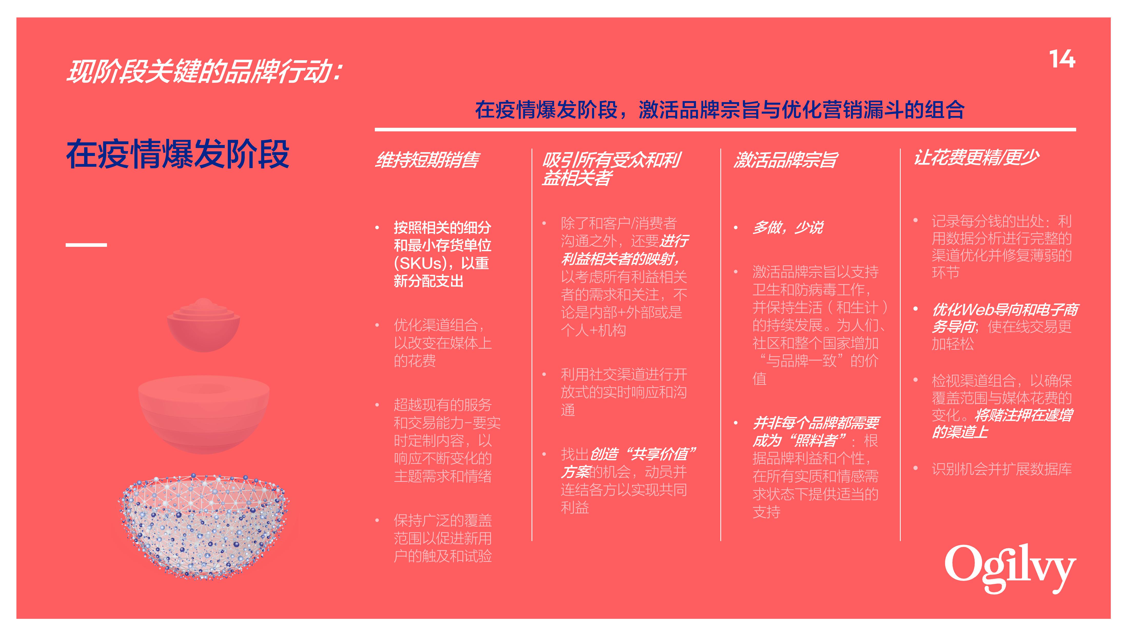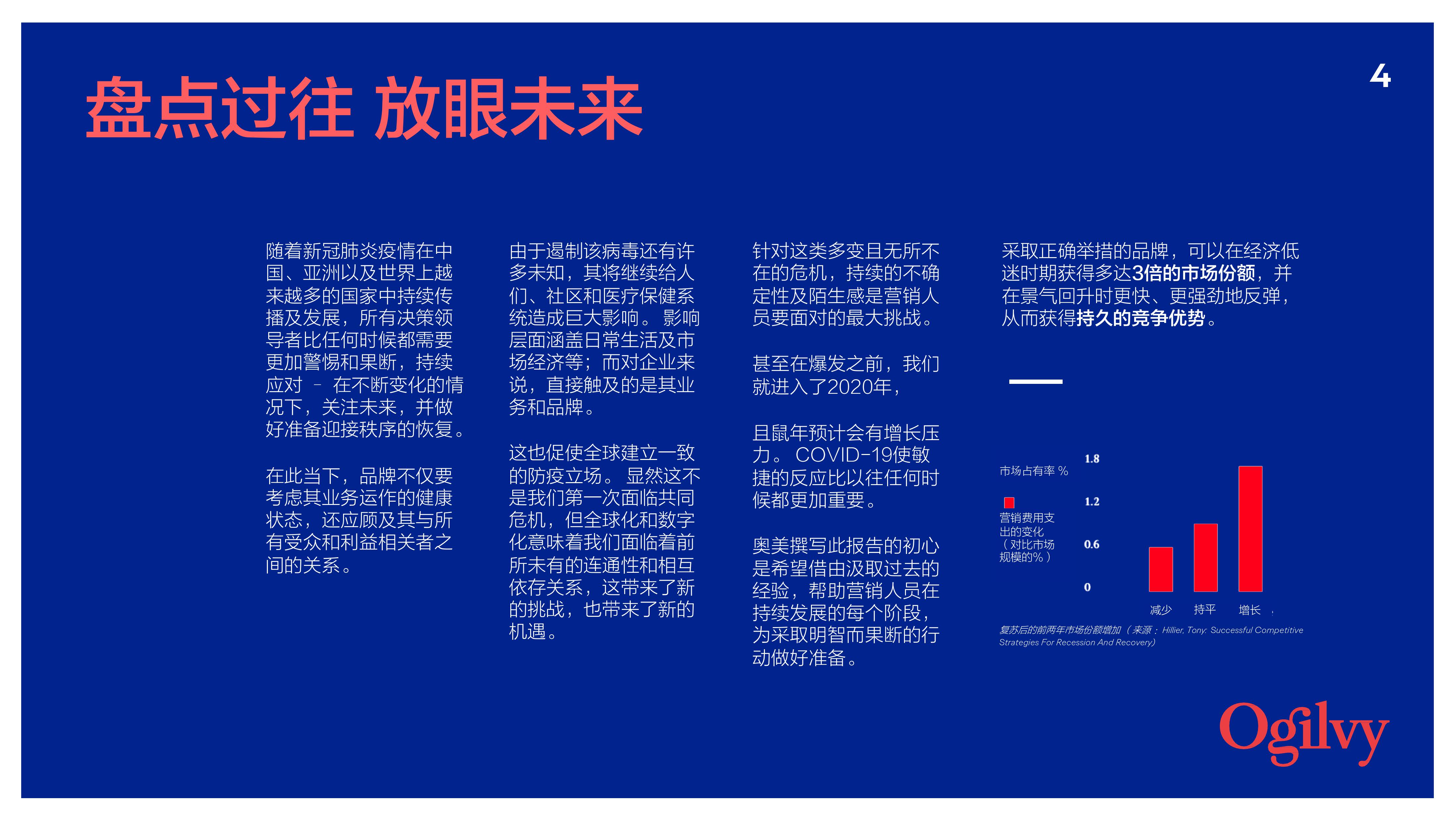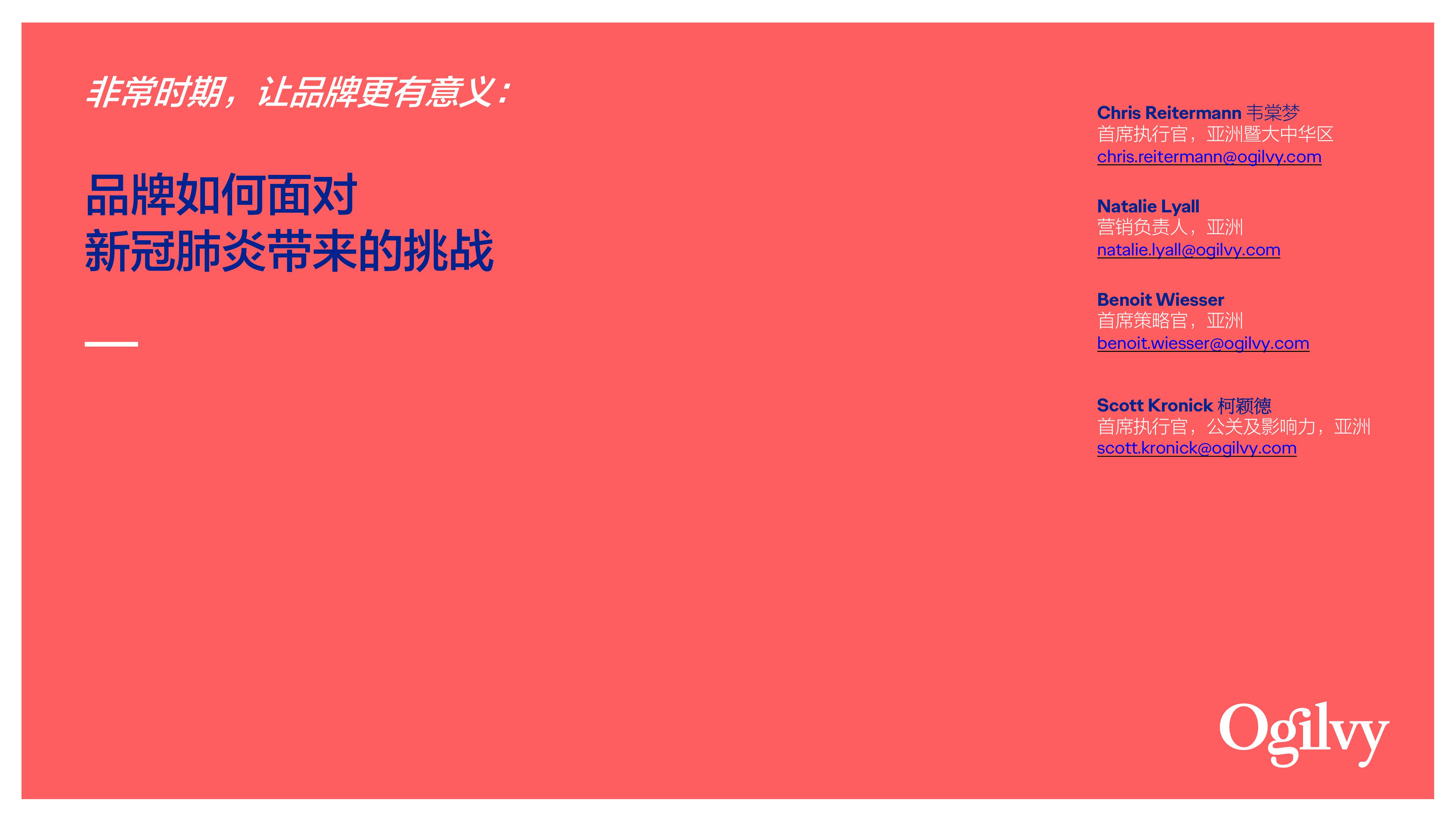 鉴于我们在 2003 年非典(SARS)和 2008 年全球金融危机期间引领品牌在不确定环境中前进的经验,我们总结所学、归纳见解,撰写了「非常时期,让品牌更有意义」这一报告,在疫情爆发期间为营销人员提供应对方法及切实可行的建议,以采取明智而果断的行动。