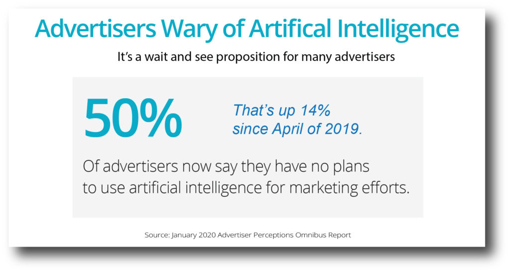 根据Advertiser Perctions 1月份的一项研究,50%的广告客户没有在营销中使用人工智能的计划。这比2019年4月的提高了14%,当时36%的广告客户表示他们没有此计划。