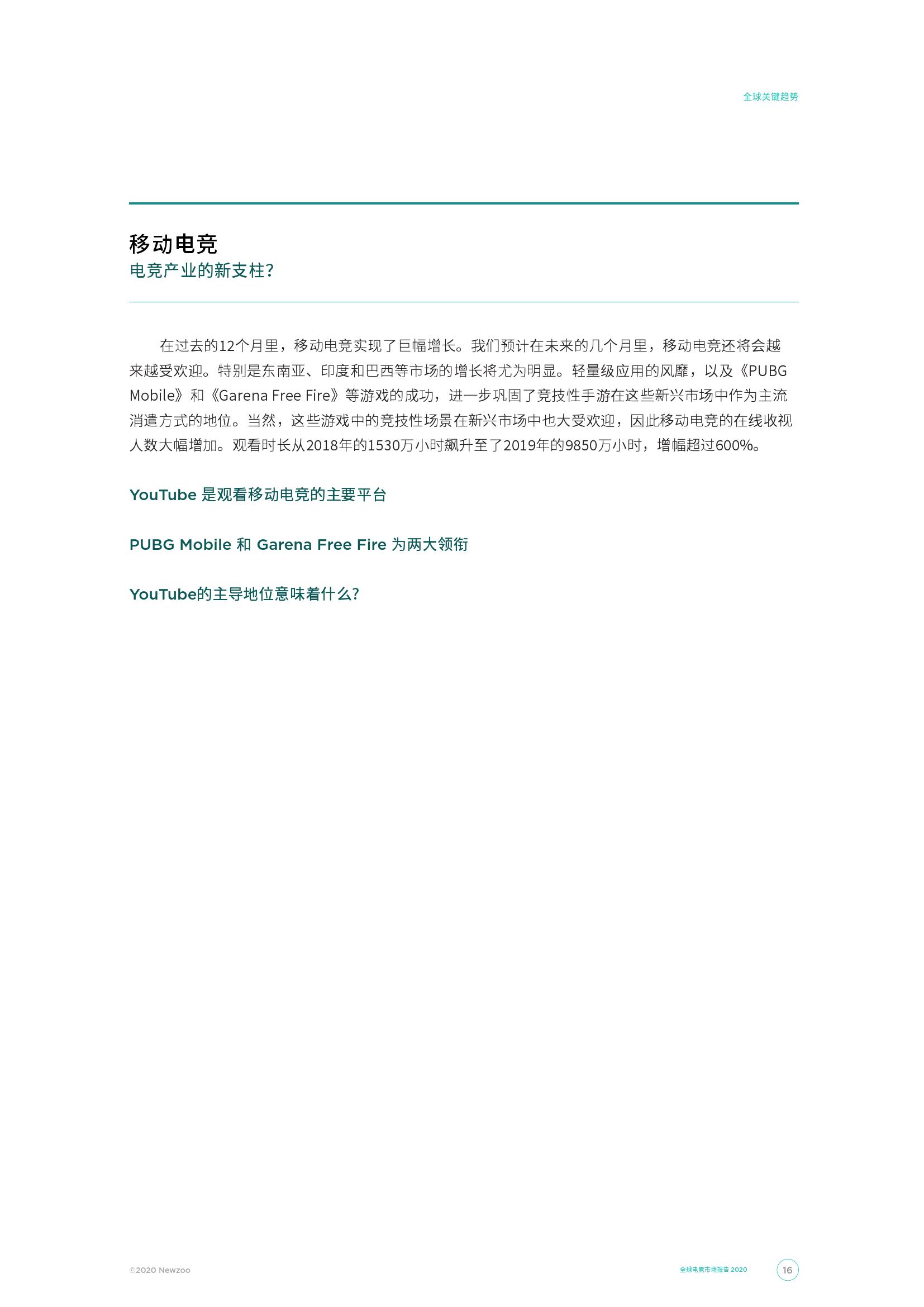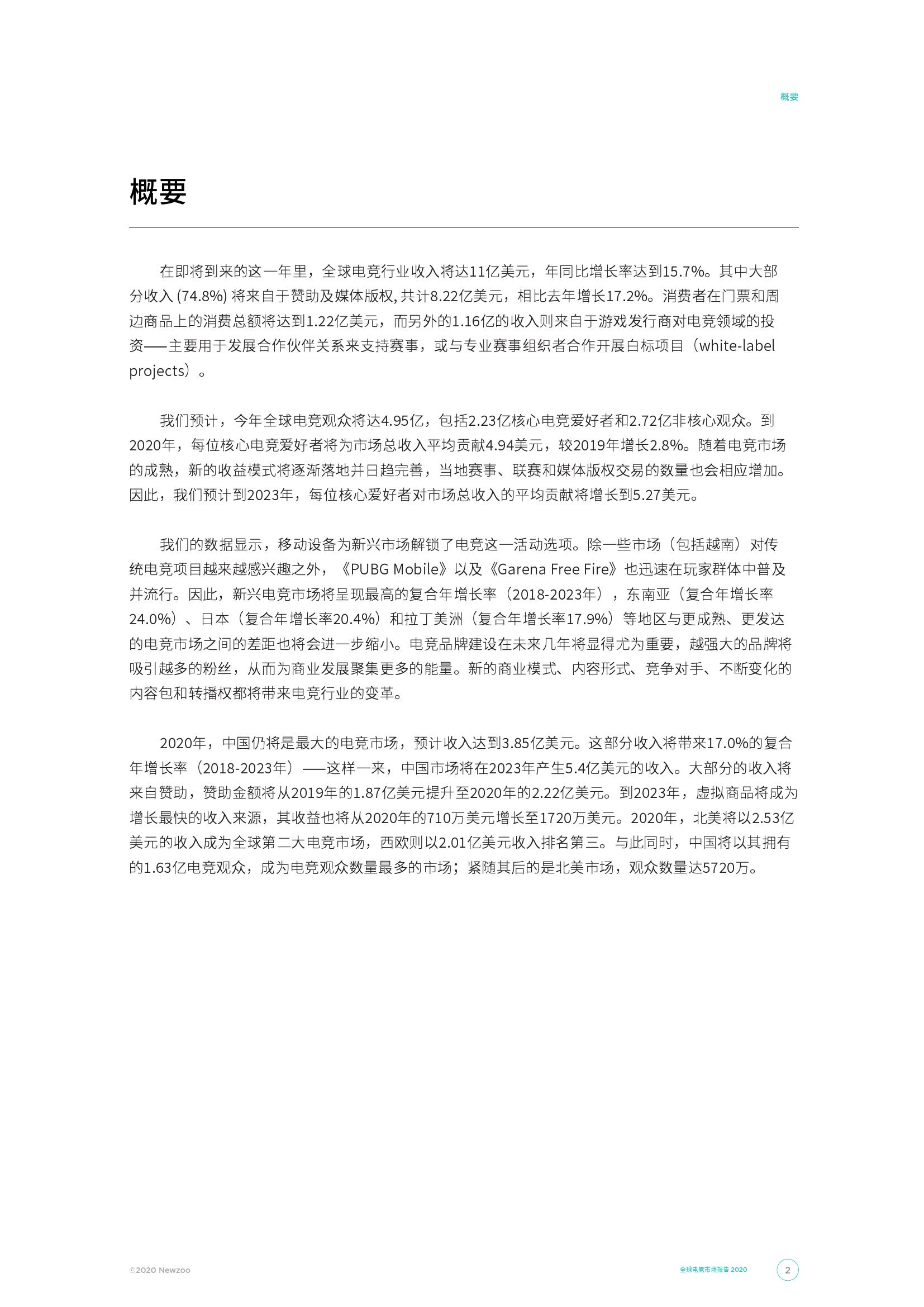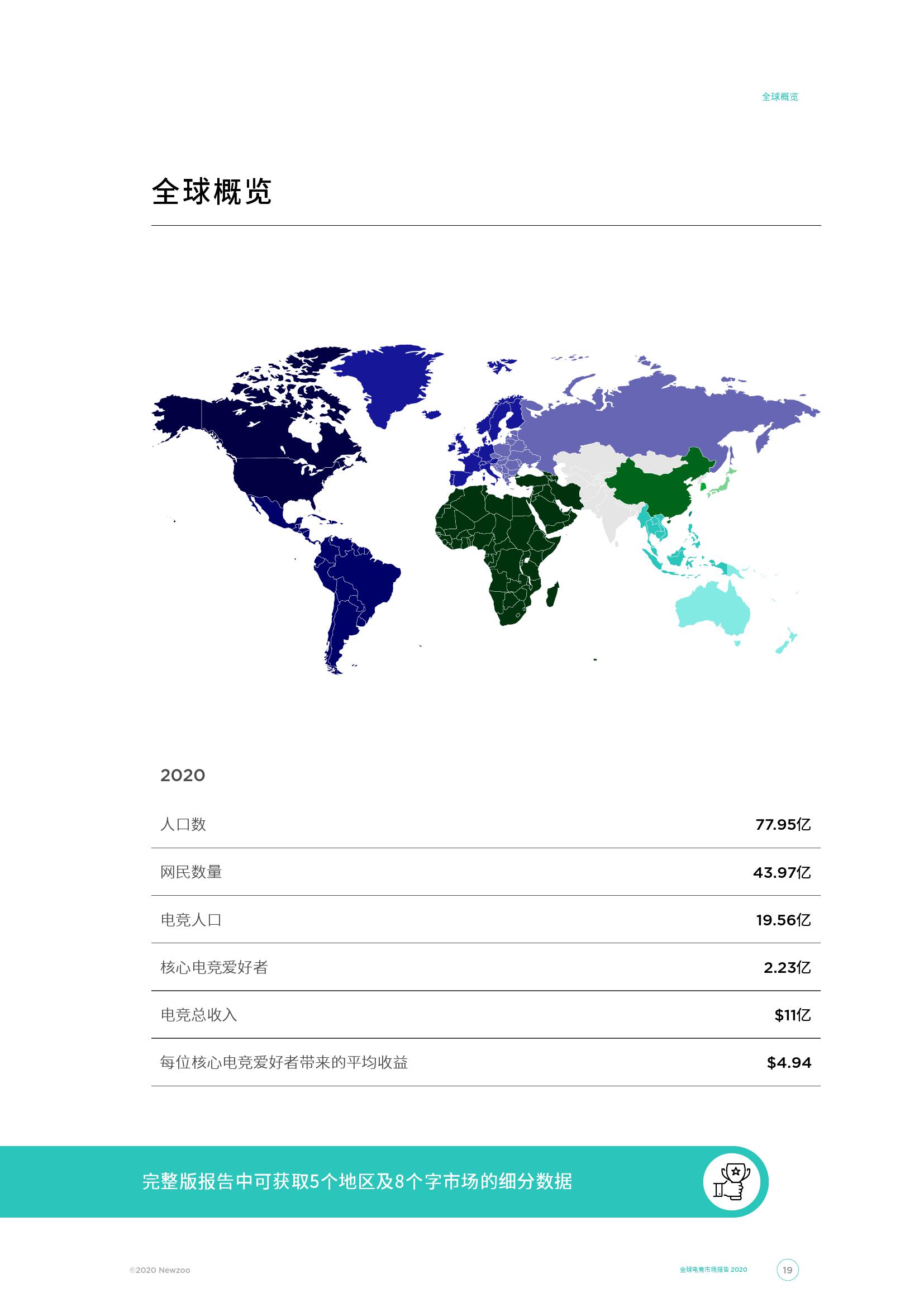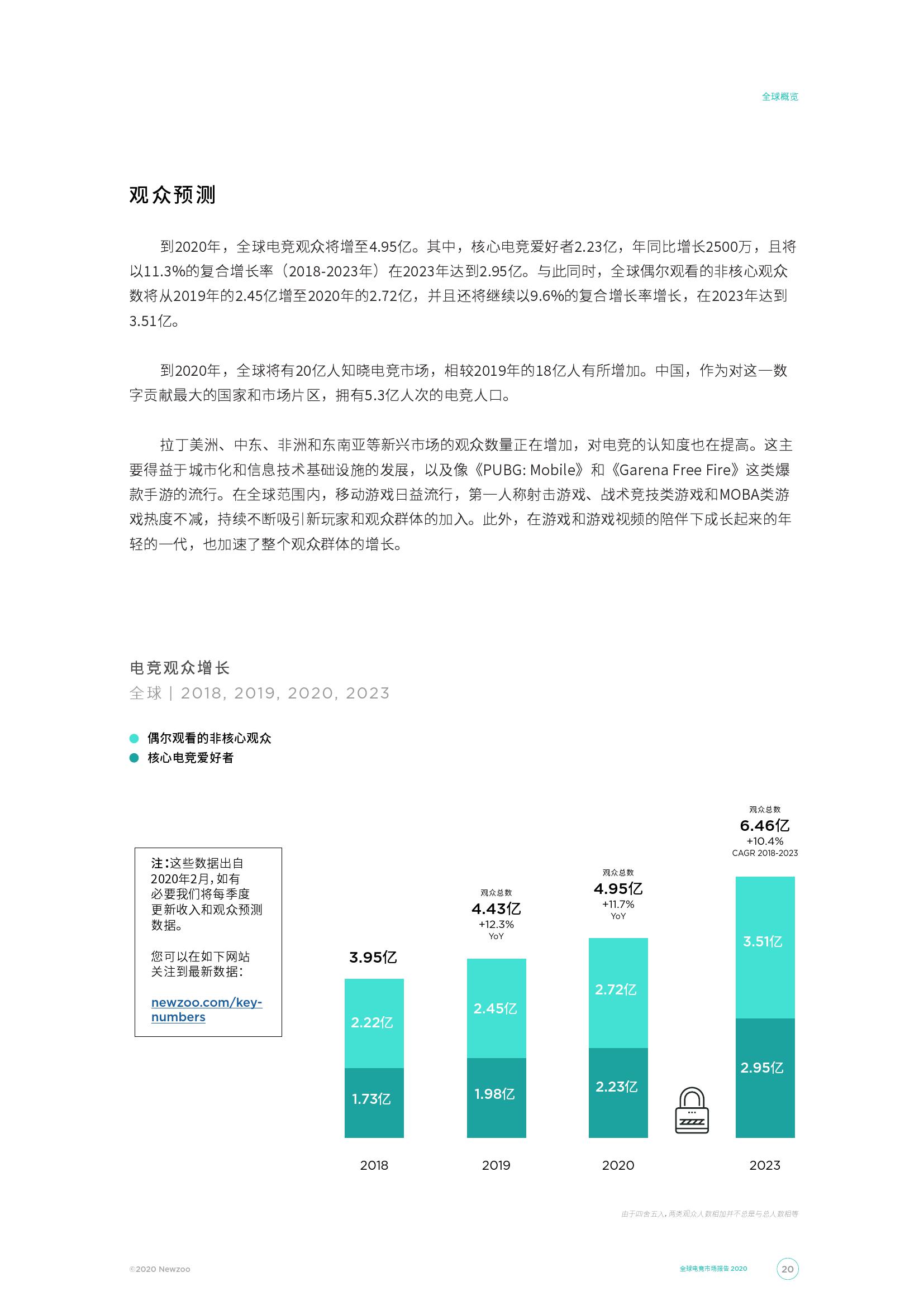 全球电竞观众总数将在2020年增长至4.95亿。这其中,核心电竞爱好者将占据2.23亿,同比增长2500万,并将以11.3%的年均复合增长率(2018-2023)在2023年增长至2.95亿。与此同时,到2020年,全球偶尔观看的非核心观众人数将达到2.72亿,高于2019年的2.45亿。2023年,这一数字或将以9.6%的年均复合增长率增长(2018-2023)至3.51亿。在拉丁美洲、中东和非洲以及东南亚的新兴市场中,电竞观众和对电竞行业的了解程度一直在增长。这主要是由于城市化和信息技术基础设施的进步,以及移动设备的爆炸性增长。