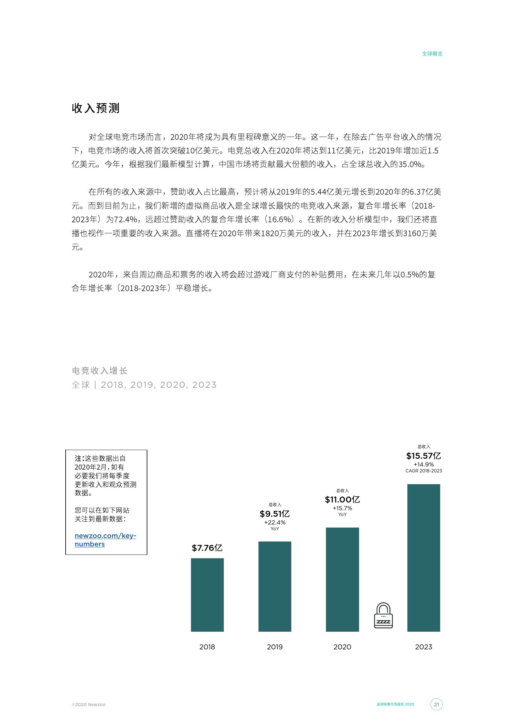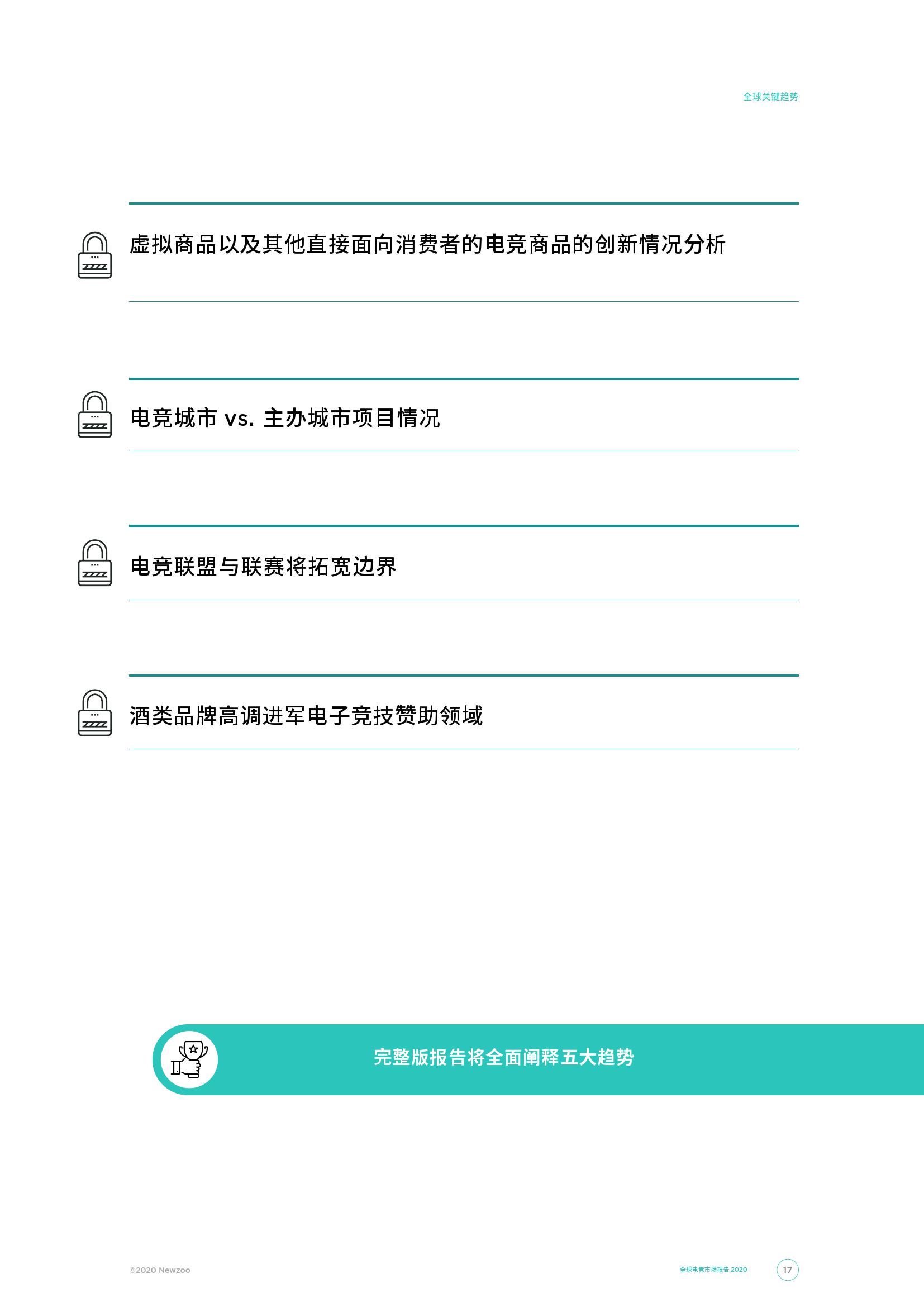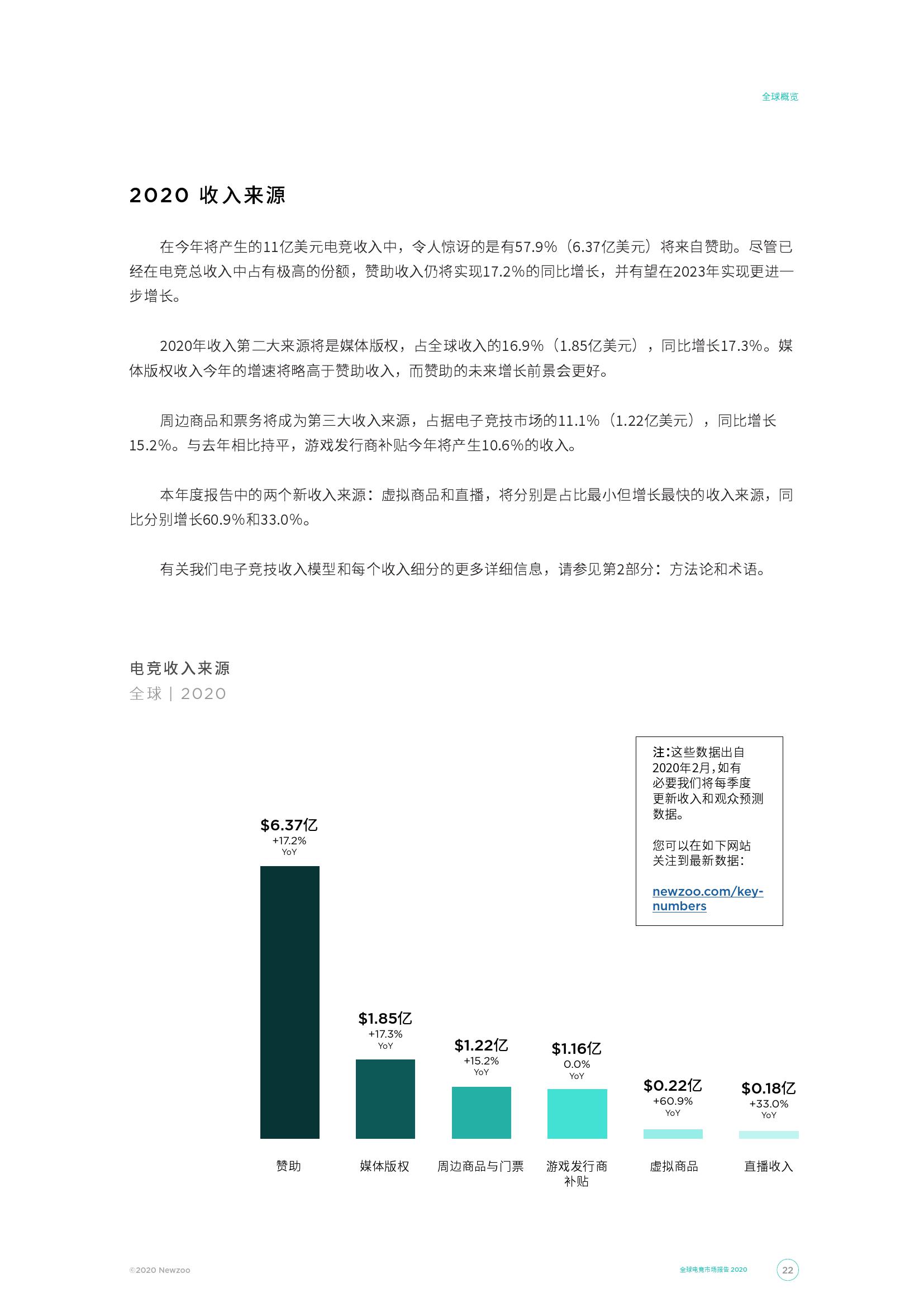 全球总收入中占比最高的电竞收入来源是赞助,2020年将达到6.37亿美元,高于2019年的5.44亿美元。而全球增长最快的电竞收入来源是我们今年新加入的一项:虚拟商品,有着高达73.4%的年均复合增长率(2018-2023),相比之下赞助的年均复合增长率为 16.6%。我们还引入直播分成作为重要收入来源之一,到2020年这部分收入将达1820万美元,2023年或将增长至3160万美元。