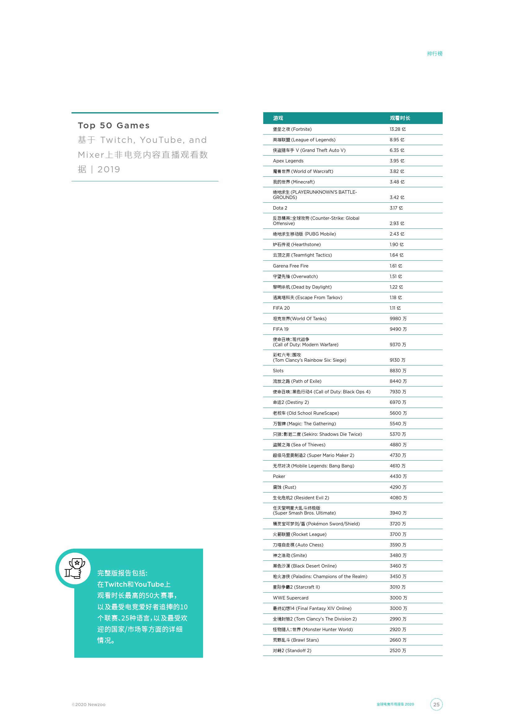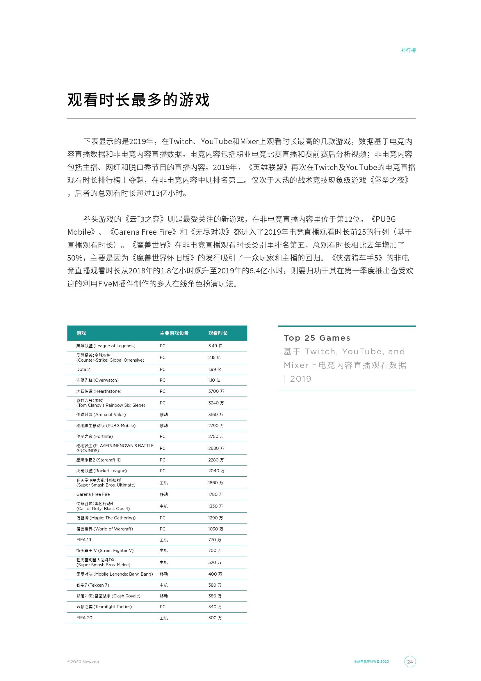 去年,全世界范围内,有885场主要电竞赛事让全球的电竞观众可以身临其境地感受现场的热烈氛围。这些赛事的门票总收入为5,640万美元,高于2018年的5,470万美元。我们的Game Streaming Tracker数据显示,英雄联盟世界赛是Twitch和Youtube上直播观看时长最多的赛事,其被观看总时长达到了1.05亿小时。