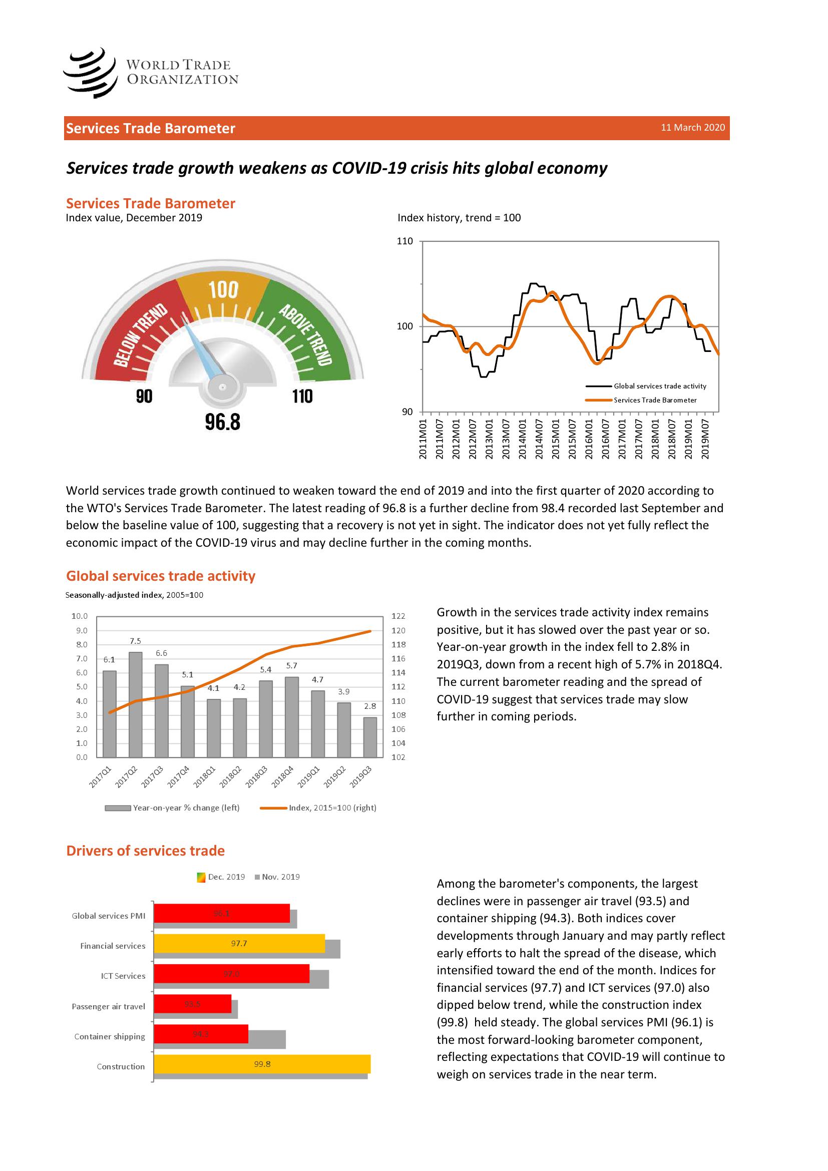 报告称,自2019年底至2020年第一季度,全球服务贸易增长继续呈放缓态势;全球服务贸易最新读数为96.8,低于去年9月份的98.4,也远低于100的基准值,表明全球服务贸易增长低于趋势水平。这一指标尚未完全反映出新冠肺炎疫情对全球经济的影响,未来几个月全球经济可能还会进一步下降。