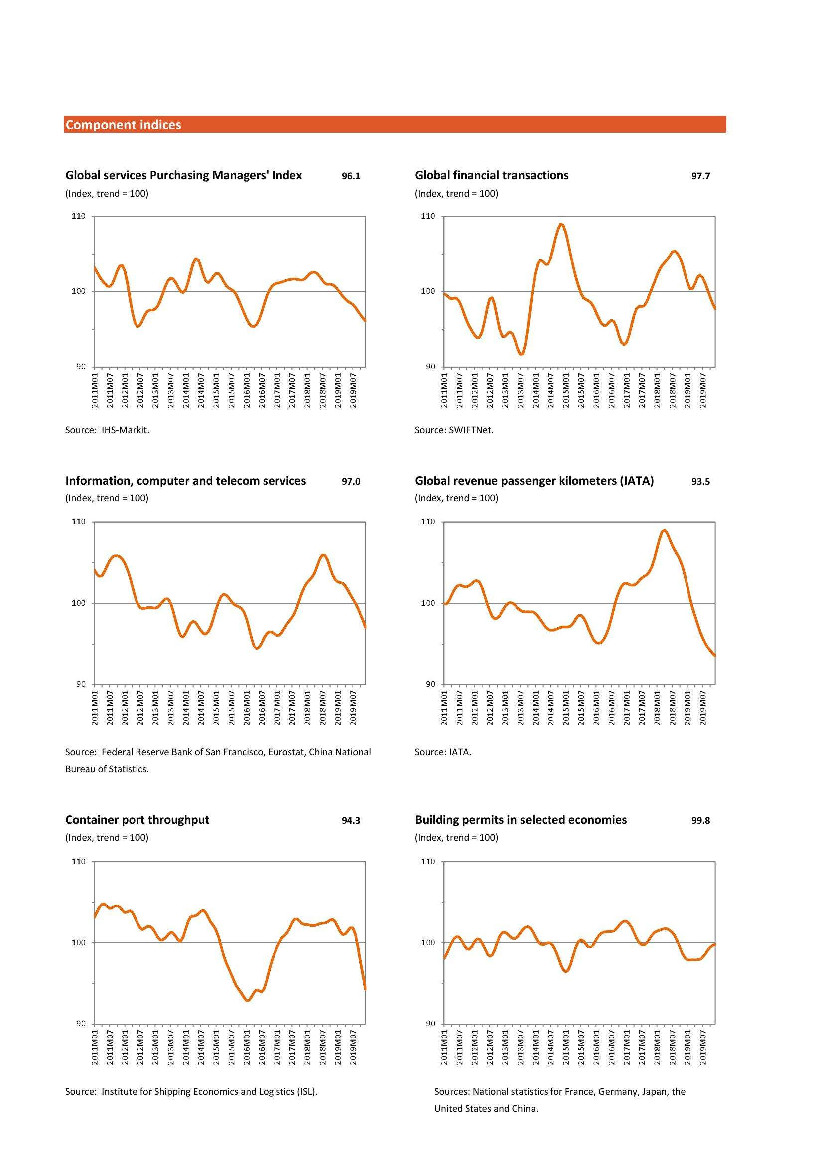 同时,全球金融交易指数和信息通信技术服务指数也低于趋势水平,其最新读数分别为97.7和97。建筑业指数保持稳定,最新读数为99.8。