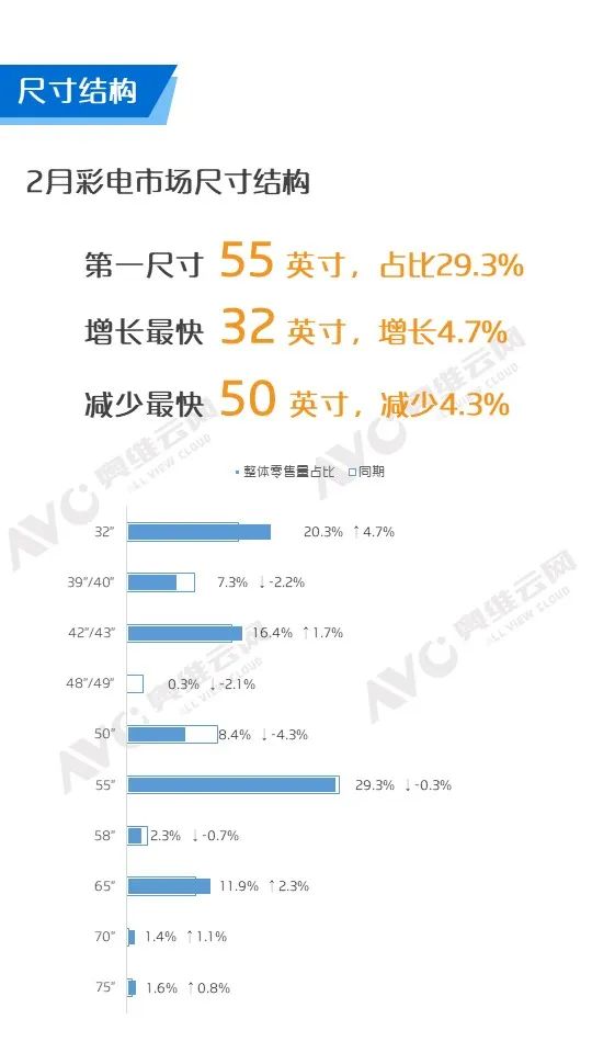 2月,中国彩电市场产品尺寸结构中,第一尺寸为55英寸,占比29.3%;增长最快为32 英寸,占比较同期增长4.7个百分点;减少最快为50英寸,占比较同期减少4.3个百分点。