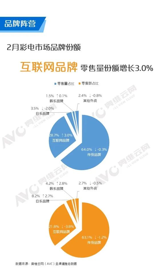 2月,中国彩电市场品牌阵营表现中,互联网品牌零售量份额增长3.0%,零售量份额下降3.8%,以价换量策略有所成效。