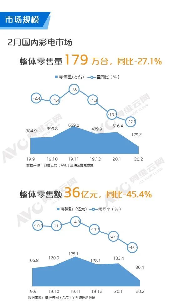 2月,中国彩电市场整体零售量 179 万台,同比-27.1%;整体零售额 36亿元,同比-45.4%。