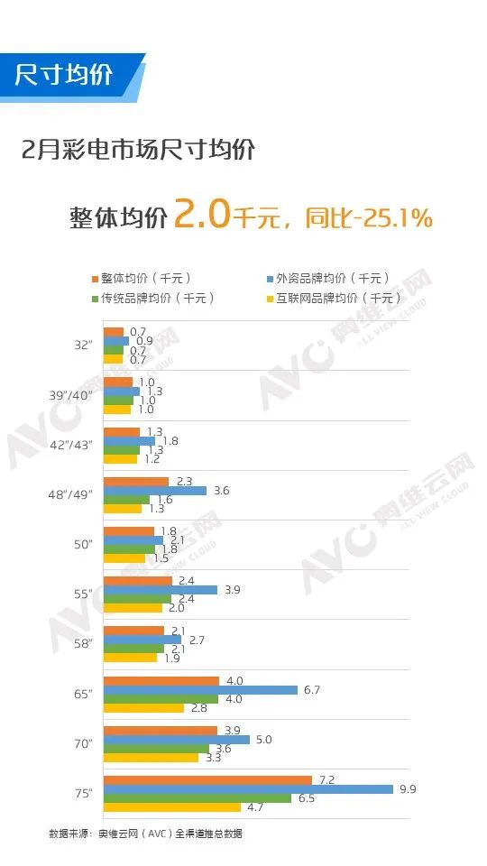 2月,中国彩电市场整体均价 2.0千元,同比-25.1%。