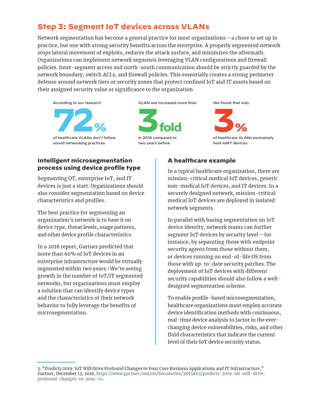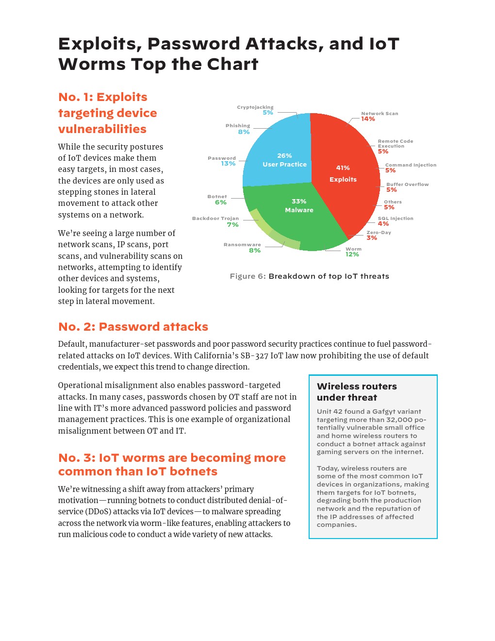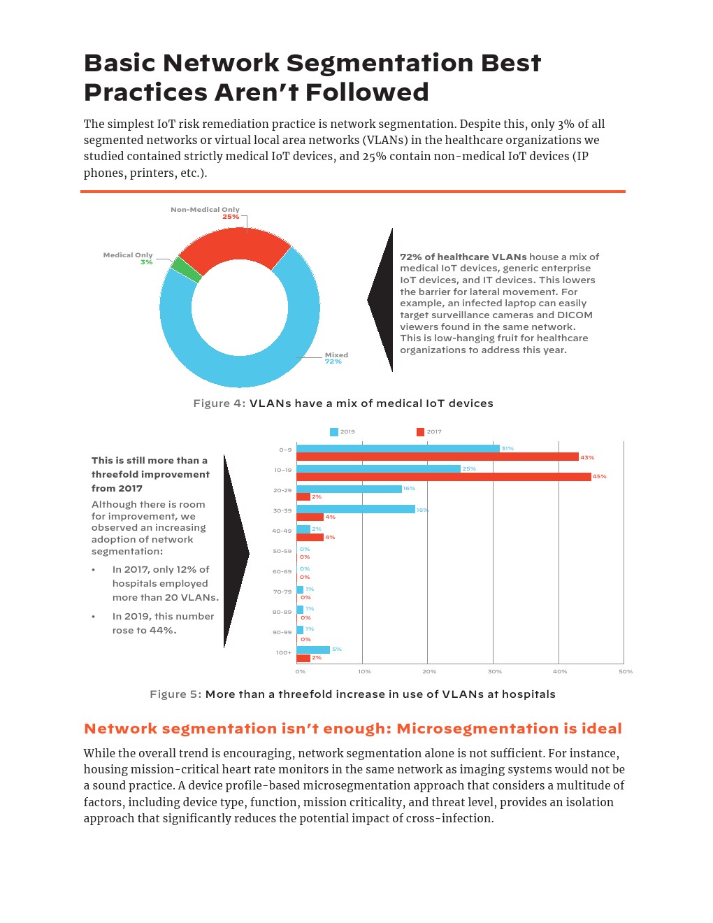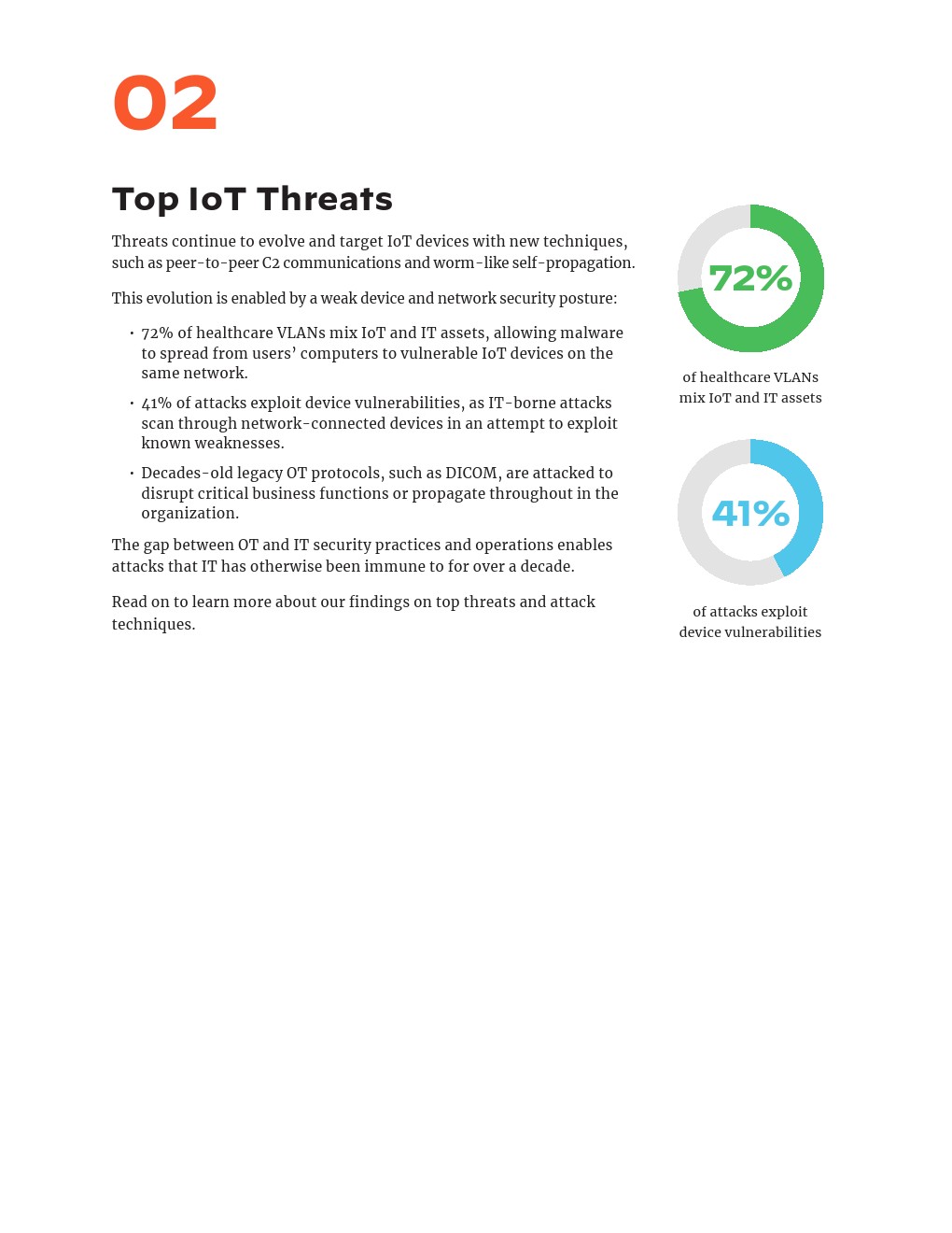 72%的医疗保健VLAN混合了物联网和IT资产,使得恶意软件能够从用户的计算机传播到同一网络上易受攻击的物联网设备。41%的攻击利用设备漏洞,因为IT传播的攻击通过网络连接的设备进行扫描,试图利用已知的弱点。