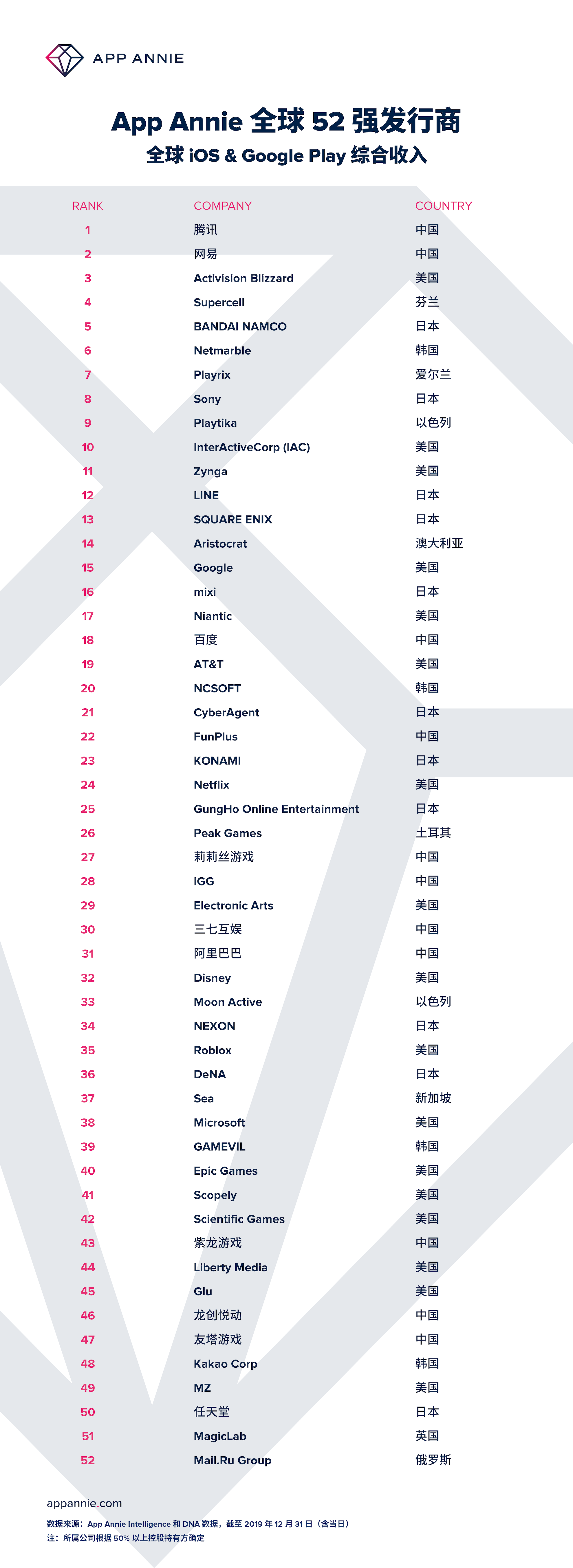 以 Farmville 系列闻名的Zynga 在 2019 年大获成功,今年在榜单中排名第 11 位,比去年上升了 10 位。如今他们的产品组合也有所扩展,其中包括 Empires & Puzzles 等 RPG 益智对战游戏,以及 Merge Dragons! 等休闲益智游戏。