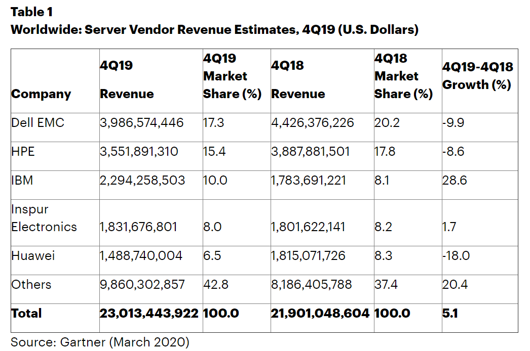 从供应商来看,Dell EMC以20.5%的收入份额和16.3%的出货量份额位居榜首。惠普以17.3%的收入份额和12.3%的出货量份额排在第二名。Inspur Electronics是前五名供应商中唯一一家2019年收入和出货量双双增长的。