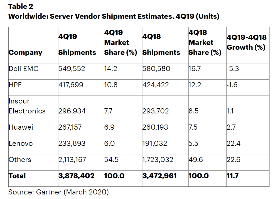 在服务器出货量方面,Dell EMC以14.2%的市场份额保持了第一的位置(见表2)。惠普以10.8%的市场份额位居第二。Dell EMC和惠普的服务器出货量均出现下滑,而联想的增长最为强劲,2019年第四季度出货量增长22.4%。