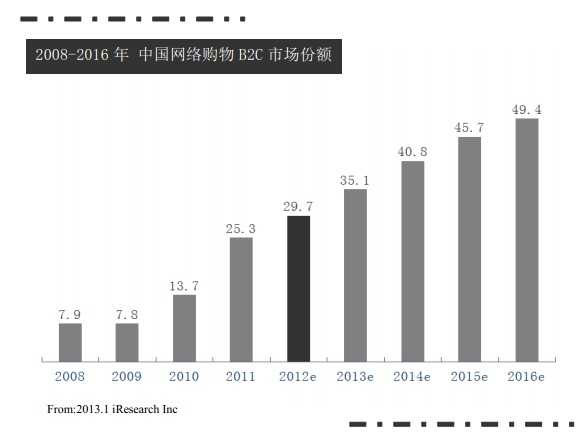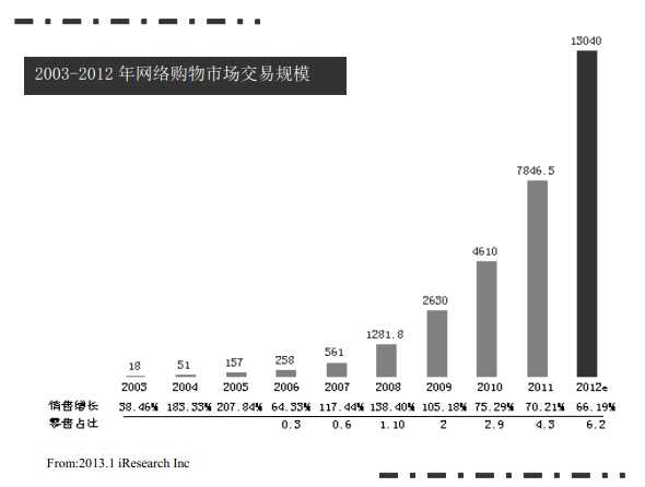 艾瑞数据显示,我国网络购物交易规模从2003年起开始快速增长,2012年达到13040亿元,同比增长66.2%。在社会消费品总零售额的占比达到6.2%。中国网络购物市场从2012年后开始逐渐进入到成熟期。在这之后,B2C占比在持续增大:2012年,B2C交易占比在整体网络购物市场交易中达到29.7%,增速95.1%,高于C2C市场的56.4%。B2C的时代已经到来。