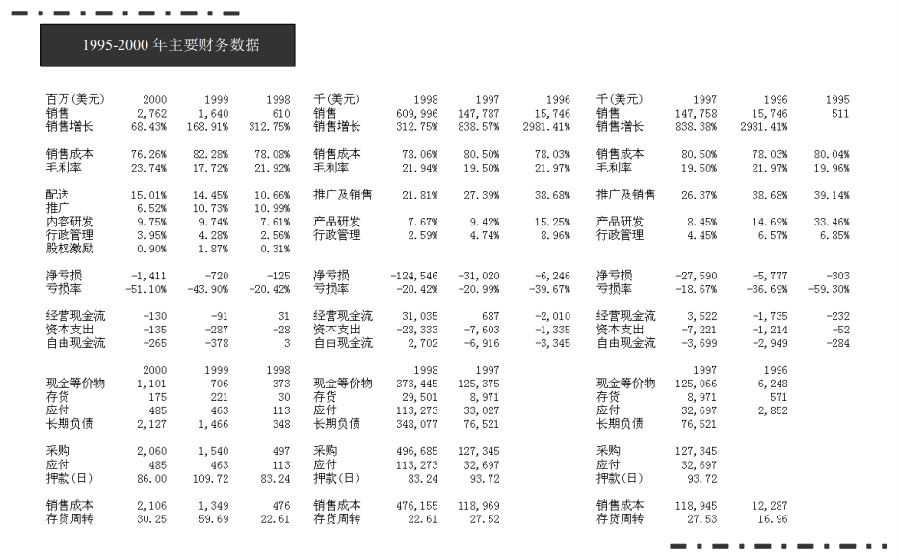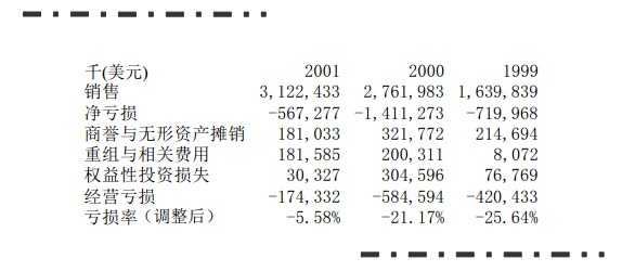 市场的突然转变迫使它进行调整与收缩,销售增长锐减到2001年只有13.05%;控制费用支出,各项费率逐步下降;于2000年达最高亏损14.11亿美元后下降;资本支出大幅消减,现金流并没有恶化。