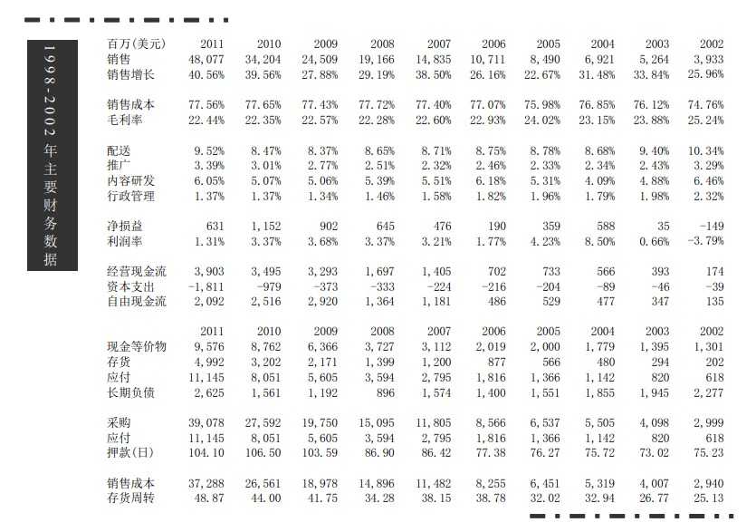 其经营现金流入增长是很稳定的,而且还超过盈利数字很多很多。尤其是从09年起,由于对供应链的把握能力加强了,其应付款周期再次延长到100天以上,虽然存货周转率下降了,可是其经营现金流整整提升了100%。这么强大的现金流,就连投资也无法完全消化,致使其自由现金流也不断升高。多余的现金,自然是先去还债了,所以这期间的长期债务呈下降趋势,随之下降的是其利息费用。