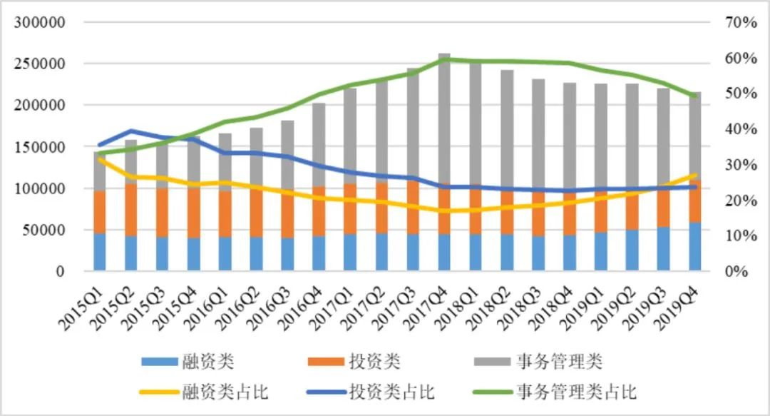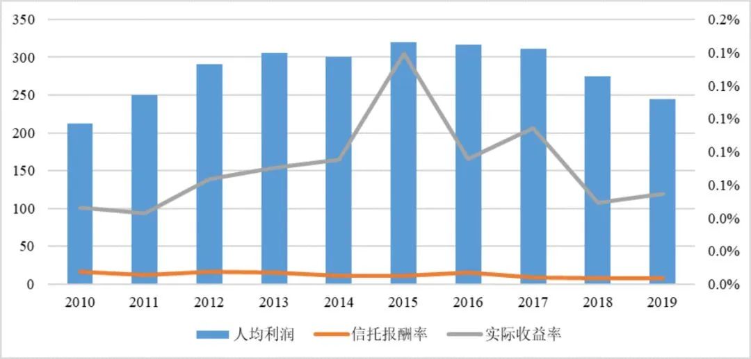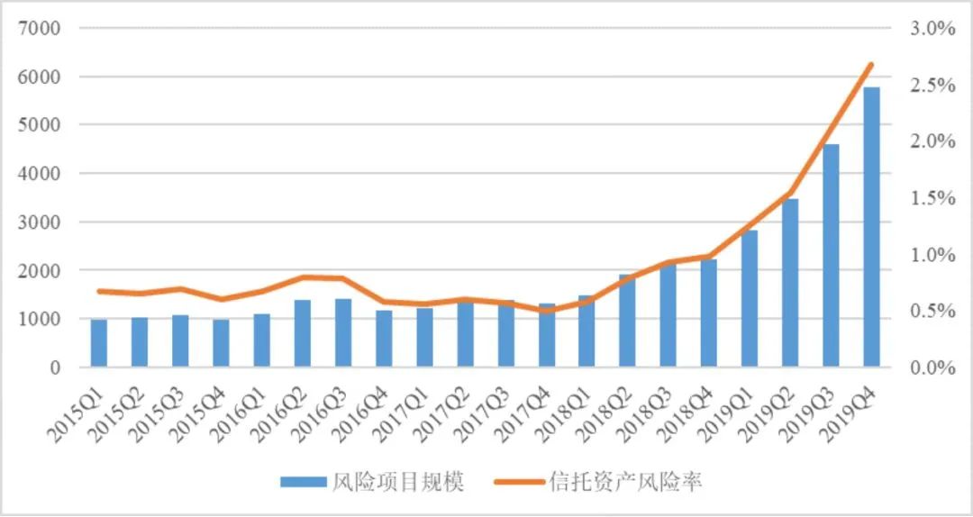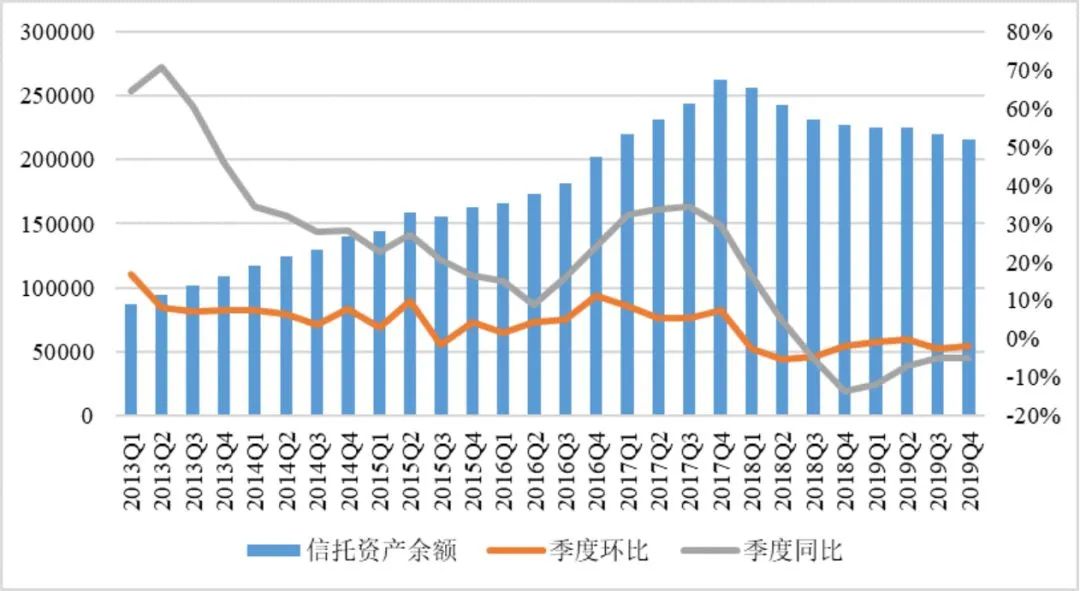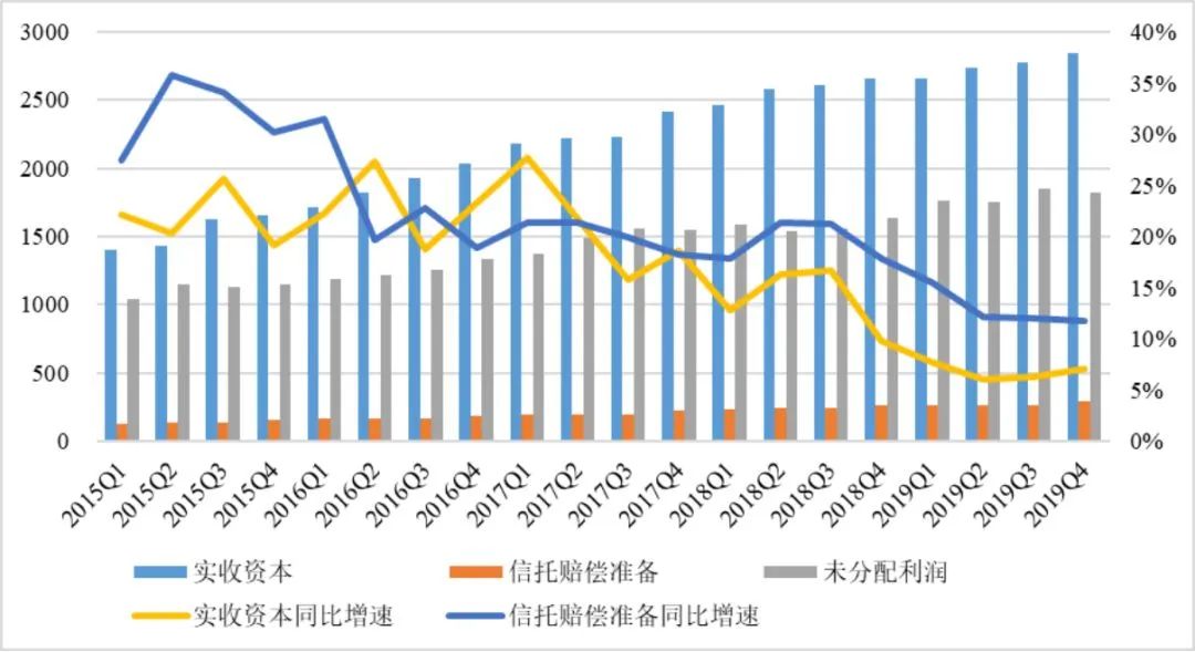 2019年度中国信托业发展评析 日前,国家金融与发展实验室主任曾刚,在中国信托业协会网站上发布了《2019年度中国信托业发展评析》(以下简称“发展评析”)。 2019年是信托业转型的重要一年,在经历了2018年的大幅调整后,信托业坚持回归本源、提质增效,不断转型,效果显著。 在全球经济复苏步伐放缓、经济、金融不确定性上升的背景下,我国信托业信托行业营业收入、净利润、信托报酬率和实际收益率均稳步增长。虽然信托资产风险率创新高,但总体可控。 业务规模稳中趋降 但资金结构持续优化 从整体规模上看,在经历了2018年较大幅度的调整后,2019年信托业资产规模下降幅度出现了明显收窄,波动率远远小于2018年,进入了平稳下行阶段。 据《发展评析》数据,截止至2019年4季度末,全国68家信托公司受托资产规模为21.6万亿元,较2018年年末的22.7万亿同比下降4.85%,小于2018年同期的13.50%。 此外,随着资管新规下通道业务发展受限,信托公司更加注重主动管理能力的培养,在信托行业整体规模稳中趋降的同时,信托资金的结构也在不断优化。 在监管引导下, 2019年我国信托业资金来源结构进一步优化,集合信托占比上升,单一资金信托占比下降。 从2019年2季度开始,集合资金信托占比就已经超过单一资金信托,成为最主要的资金来源。 截至2019年4季度末,集合资金信托规模9.9万亿,占比为45.93%,单一资金信托规模约8万亿,占比为37.1%。 单一资金信托占比过高一直是信托业的难题。2010年二季度,单一资金信托的占比甚至曾达到83.27%的高位。目前看来,在2019年,解决该难题获得了阶段性成果。 从信托功能的角度看,服务实体是信托业的重要使命,而通道类业务占比一定程度上阻碍了信托业回归主业、支持实体经济。而2019年,随着通道类业务的不断下降,信托业务结构变化较为明显,信托业服务实体的功能得到了一定程度的强化。 整体来看融资类信托占比有所上升,事务管理类信托占比显著下降,投资类信托则基本稳定。 从信托资金投向的角度看,信托业坚持脱虚向实、支持实体经济的转型方向,转型效果显著。 整体来看,工商企业继续在资金配置中占据首位,基础产业和房地产占比分别上升到第二和第三位。此外,在2018年占比排名第二的金融机构今年跌倒了第四位,去通道、治乱象效果明显。 从具体投向来看,在基础产业这一投向,为应对经济下行压力、实现“六稳”的政策目标,信托业投入基础行业的资金占比也稳步上升。截止到2019年4季度末,投向基础产业领域的信托资金总额为2.82万亿,占比15.72%,较2018年上升1.14个百分点,一跃成为信托资金第二大配置领域。 在房地产方面,在“房住不炒”的政策要求下,随着监管约束的不断强化,2019年,房地产信托规模增长趋于停滞,占比因为信托资产总规模的下降有小幅上涨。 此外,投向金融机构的信托资金也继续回落,截至2019年4季度末,投向金融机构的信托资金总额为2.5万亿,环比下降6.45%,同比下降17.34%。 2017年,由于同业业务回流,金融机构一度成为第二大信托资金配置领域。在防风险、去杠杆的背景下,通道类业务受到极大压缩。自2018年1季度起,投向金融机构的信托资金环比增量即变为负数,占比持续从2018年末的第二位降到第四位。 资本实力提升 营收、净利指标持续向好 除资金结构不断优化外,信托业的各项财务指标也整体向好。 从所有者权益的角度看,资本实力作为金融机构抵御风险的基础,是信托长期稳健发展的重要保障。 2019年,信托行业资本实力进一步增强,截止到4季度末,68家信托公司左右者权益规模达到6316.27亿元,较2018同比上升9.86%。 从所有者权益的构成来看,截至2019年4季度末,实收资本为2842.4亿元,较去年年末增加188.25亿元,信托赔偿准备291.24亿,比去年年末增加30.53亿。信托行业的实收资本、信托赔偿准备保持增长,意味着信托业应对风险的能力稳步提升。 从固有资产的角度看,截至2019年4季度末,68家信托公司固有资产规模达到7677.12亿元,同比增长6.73%。 在固有资产运用方式方面,自2014年3季度以来,投资类在固有资产运用中占比呈现稳步上升趋势。2019年,投资类资产余额占比微升,基本与去年持平,货币类资产和贷款类资产的占比有所下降。 在经营业绩方面,面临诸多挑战的信托业,在行业转型和高质量发展方面取得显著成效,营业收入和净利润等指标稳步提升。 2019年4季度,信托行业经营收入下滑的态势更是得到了扭转。该季度,信托业实现经营收入累计1200.12亿元,同比增长5.22%,与2018年-4.2%相比,增速大幅提高了9.42个百分点。 净利润方面,在2018年信托业利润大幅下降的基础上,2019年末,信托业净利润增速重回正数。2018年信托业净利润有大幅回调,当年信托业净利润为731.8亿,同比下降11%。2019年4季度,信托行业利润总额727.05亿元,与2018年基本持平。 但值得注意的是,信托行业人均利润仍有待提升。2019年,信托行业人均利润为244.23万元,略低于2018年的275.02万元。 在自身业绩回暖的同时,信托业也为投资者创造和实现了更多价值。从信托报酬率来看,4季度的平均年化综合信托报酬率为0.37%,较2018年同期上升了0.02%;平均年化综合实际收益率为5.49%,,比2018年同期上升0.58%。 在金融市场整体资产收益率下行的背景下,信托报酬率和实际收益率录得小幅回升实属不易。 挑战:更多风险暴露 但整体可承受 随着国内经济进入减