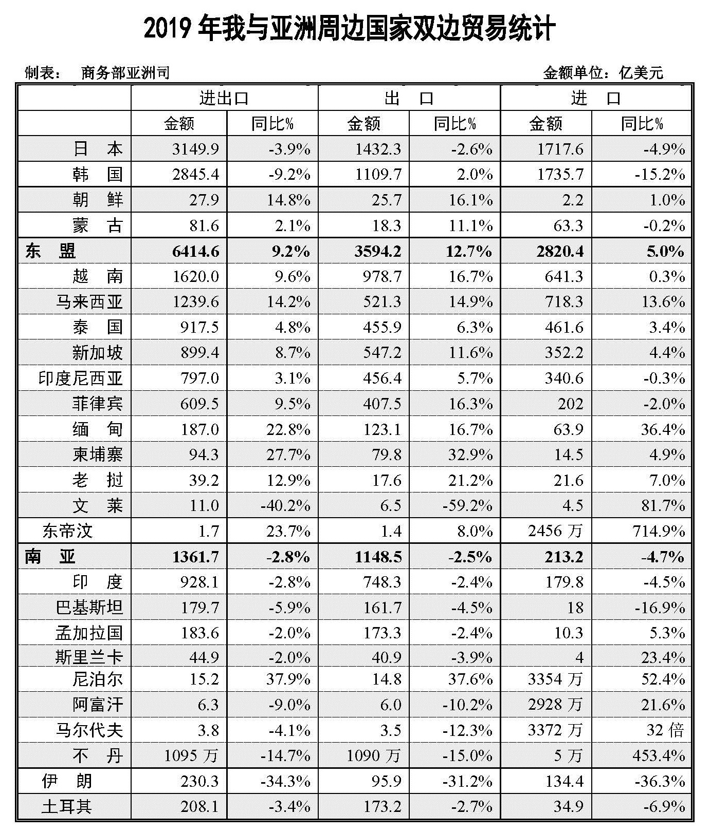 商务部:2019年12月中国与亚洲周边国家双边贸易统计 更多阅读:商务部:2017年全年全国吸收外资情况商务部:2020年1-5月我国汽车出口37.3万辆商务部:2018年5月份我国消费市场运行情况商务部:2018年5月中国吸收外资金额达588.1亿元 同比增长7.6%商务部:2018年1-4月中国服务进出口总额达到16653.5亿元 同比增长11.9%商务部:中国数字服务贸易发展报告 2018商务部:2018年Q1中国对外投资同比增24.1%商务部:2017年1-12月我国对外贸易情况商务部:中国对外贸易形势报告(2017年秋季)商务部:2020年春季国际商品市场走势商务部:2019年中国茧丝绸行业发展报告商务部:关于中美经贸关系的研究报告商务部:中国自由贸易试验区发展商务部:2016年1-6月全国新设立外商投资企业13402家 同比增长12.5%商务部:中国外商投资指引(2022 版)