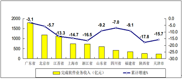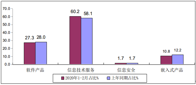 工信部:2020年1-2月软件业经济运行情况 1-2月,受新冠肺炎疫情影响,需现场支持的技术服务和软件招投标项目等进度受阻,我国软件和信息技术服务业(以下简称软件业)的软件业务收入、利润、出口、人员工资总额均出现大幅下降,细分领域表现各异。 一、总体运行情况 软件业务收入急速下行。1-2月,我国软件业完成软件业务收入8008亿元,同比下降11.6%,增速同比回落25.2个百分点,较去年全年回落27个百分点。 图1 2019年1-2月以来软件业务收入增长情况 利润明显回落。1-2月,全行业实现利润总额981亿元,同比下降11.8%,增速同比回落18.8个百分点。 图2 2019年1-2月以来软件业利润总额增长情况 软件出口大幅下降。1-2月,软件业实现出口56.6亿美元,同比下降18.9%。其中,外包服务出口下降33.8%,增速同比回落39.0个百分点;嵌入式系统软件出口下降22.4%。 图3 2019年1-2月以来软件业出口增长情况 从业人数小幅增长,工资总额小幅下降。1-2月,我国软件业从业平均人数584万人,同比增长0.9%。从业人员工资总额同比下降2.6%,增速同比回落16.4个百分点。 图4 2019年1-2月以来软件业从业人员工资总额增长情况 二、分领域运行情况 软件产品收入大幅下降。1-2月,软件产品实现收入2189亿元,同比下降13.7%,增速同比回落24.8个百分点,占全行业收入的比重为27.3%。其中,工业软件产品收入达到233亿元,同比下降10.9%,占软件产品收入比重为10.6%。 信息技术服务收入降幅较小。1-2月,信息技术服务实现收入4824亿元,在全行业收入中占比为60.2%,同比下降8.4%,下降幅度相对较小,但增速同比回落25.2个百分点。其中,电子商务平台技术服务收入853亿元,同比增长3.5%,但增幅较去年全年回落24.6个百分点;云服务收入209亿元,同比下降33.3%;大数据服务收入254亿元,同比下降4.0%;集成电路设计收入226亿元,同比下降6.4%。 信息安全产品和服务收入大幅下滑。1-2月信息安全产品和服务共实现收入133亿元,同比下降11.6%,增速同比回落24.7个百分点。 嵌入式系统软件收入降幅较大。1-2月,嵌入式系统软件实现收入862亿元,同比下降22.0%,增速同比回落26.9个百分点。由于和制造业紧密相关,嵌入式系统软件收入在四个软件分领域中下降幅度最大。 图5 2020年1-2月软件业分类收入占比情况 三 分地区运行情况 东部地区软件业收入下降幅度相对较小,西部和东北地区降幅较大。1-2月,东部地区完成软件业务收入6837亿元,同比下降9.4%。中部地区完成软件业务收入104亿元,同比下降12.9%。西部地区完成软件业务收入863亿元,同比下降21.7%。东北地区完成软件业务收入204亿元,同比下降29.6%。东中西和东北四个地区软件业务收入在全国总收入中的占比分别为:85.4%、1.3%、10.8%和2.5%。 图6 2020年1-2月软件业分地区收入增长情况 主要软件大省业务收入不同程度下降。1-2月,软件业务收入居前5名的广东、北京、江苏、上海、浙江软件业务收入分别下降3.1%、5.7%、13.3%、14.7%、16.5%,五省市合计软件业务收入占全国比重为69.7%。 图7 2020年1-2月软件业务收入前十位省市增长情况 中心城市软件业务收入大幅下降。1-2月,全国14个副省级中心城市实现软件业务收入4378亿元,同比下降10.2%,占全国软件业务收入比重达54.7%;中心城市软件业利润总额同比下降9.9%。 图8 2019年1-2月以来副省级中心城市软件业务收入增长情况 更多阅读:工信部:2013年1-7月中国软件业经济运行情况工信部:2024年1-2月份软件业经济运行情况工信部:2021年上半年软件业经济运行情况工信部:2021年1-8月份软件业经济运行情况工信部:2019年1-10月软件业经济运行情况工信部:2021年1-2月软件业经济数据运行情况工信部:2020年1-11月软件业经济运行情况工信部:2020年中国软件和信息技术服务业综合发展指数报告工信部:2020年1-10月软件业经济数据运行情况工信部:2019年软件和信息技术服务业统计工信部:2018年Q1-Q3中国软件和信息技术服务业完成软件业务收入44990亿元工信部:2017年软件业经济运行情况工信部:2013年1-10月中国软件业经济运行情况工信部:2015年1-5月软件业经济运行情况工信部:2024年1-5月中国规上电子信息制造业增加值同比增长13.8%