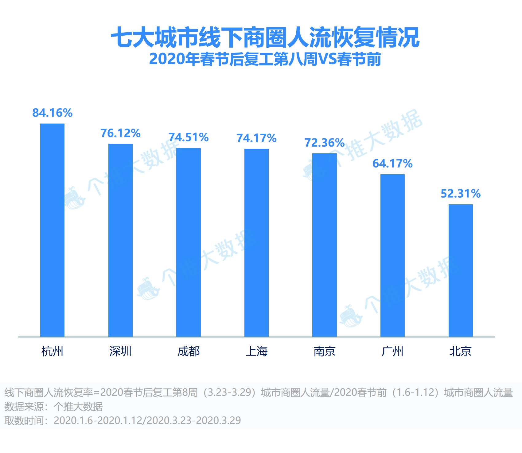 每日互动个推大数据显示,截至2020年春节后复工第八周(3月23日-3月29日),7大一线、新一线城市中,杭州线下商圈人流恢复程度最高,已恢复到春节前水平的84.16%,深圳以76.12%的恢复率排名第二,成都的恢复率为74.51%。北京因受海外疫情的影响,疫情防控措施较为严格,其线下商圈的恢复率为52.31%。