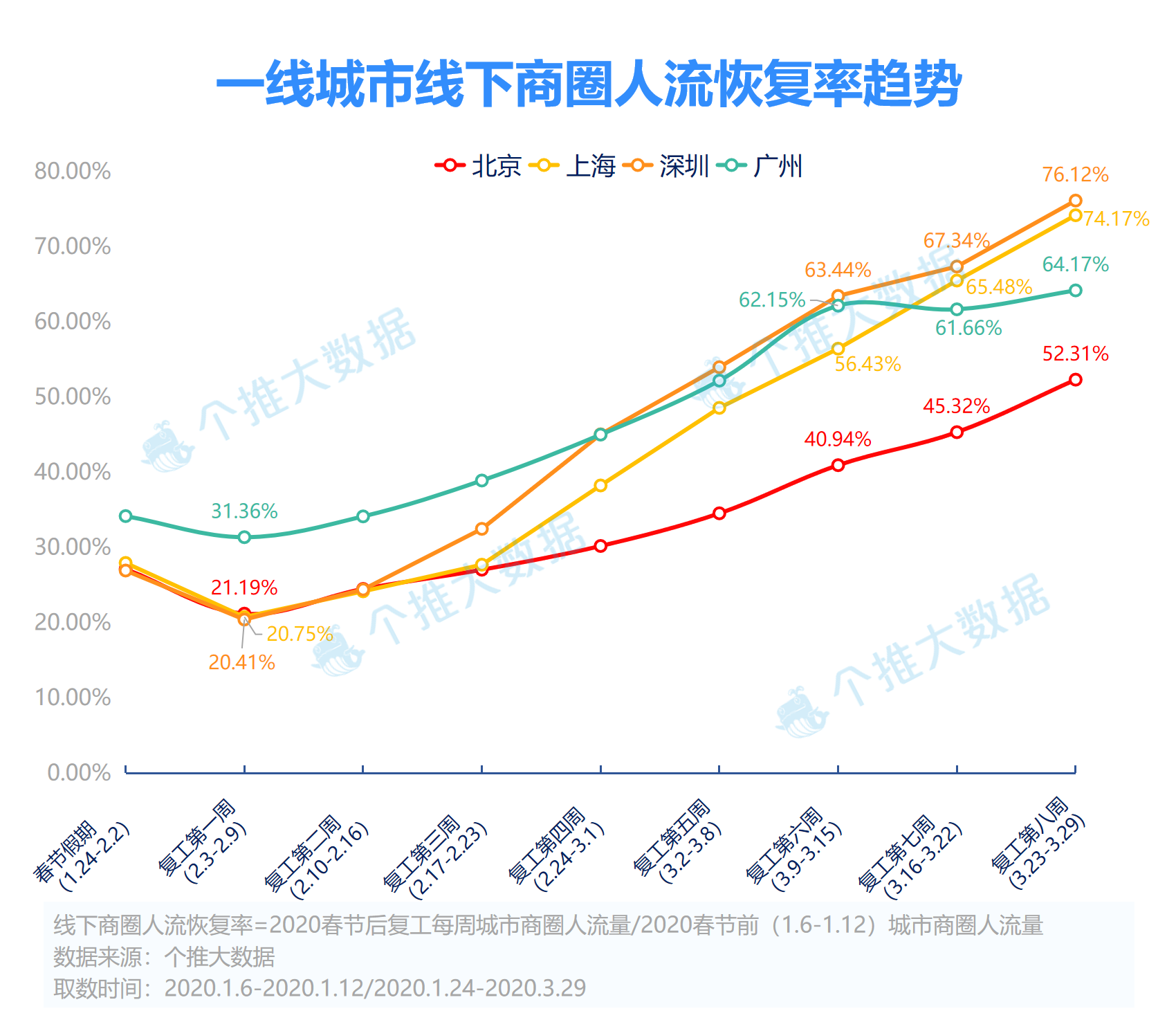 从线下商圈人流恢复趋势来看,北上深广四大一线城市中,北京的线下商圈人流一直处于稳步回升的态势;深圳的线下商圈人流从复工第二周(2月10日-2月16日)开始按下了恢复的快进键;上海的线下商圈人流恢复程度从复工第三周(2月17日-2月23日)开始每周都上升近10%;广州自3月中旬起,受海外疫情的影响,疫情管控趋严,人们的防护意识进一步加强,线下商圈的人流恢复放缓。