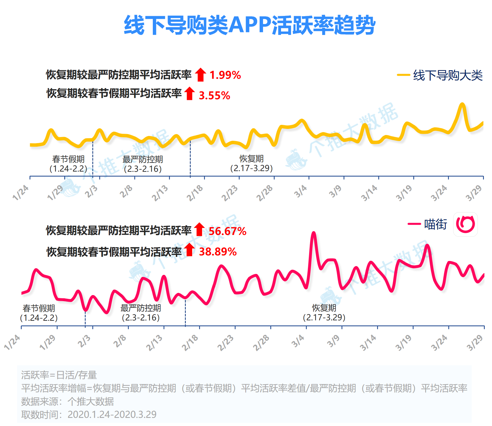 个推大数据对喵街、美味不用等、大众点评等线下导购类APP的活跃率情况进行了洞察。数据显示,线下导购类APP的活跃率比较平稳,进入3月后活跃率略有提升。其中,喵街的表现较为亮眼。喵街在恢复期(2月17日-3月29日)的平均活跃率相较最严防控期(2月3日-2月16日)和春节假期(1月24日-2月2日)分别上涨了56.67%和38.89%。在这段时间里,喵街相继推出了导购直播、爆款抢购、粉丝专项福利等活动,并且通过银泰百货会员体系激活会员用户,让更多人体验到了“云逛街”的愉悦。