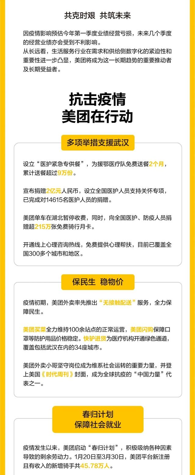 公司持续为商家提供高效的本地配送网络,为商家提供一揽子的解决方案,包括在綫营销、生产及运营数字化、聚合支付、食品供应链 及金融服务解决方案。 例如,美团2019年8月上线了菜品推荐信息流,菜品推荐信息流让商家有更多机会通过展示爆款菜式并吸引新消费者,同时提高他们对新消费者的转化率。这些举措也大幅提升了公司的在线营销服务收入,同比增长118.6%。