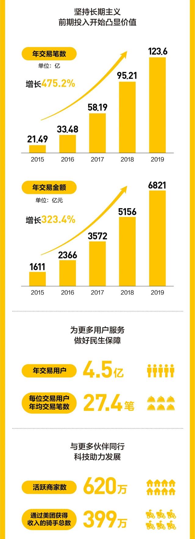截止到2019年底,年度交易用户数达到4.505亿人,活跃商家数增至620万人,平均每个交易用户交易次数为27.4次,高于2018年的23.8次。