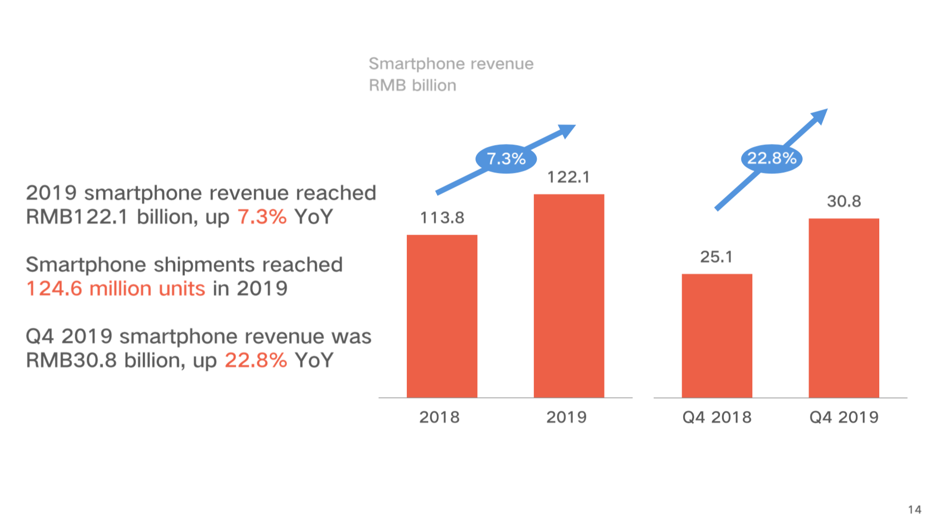 【智能手机】2019年营收同比增长7.3%至1221亿元,出货量达到1.246亿部,4Q营收同比增长22.8%至308亿元。