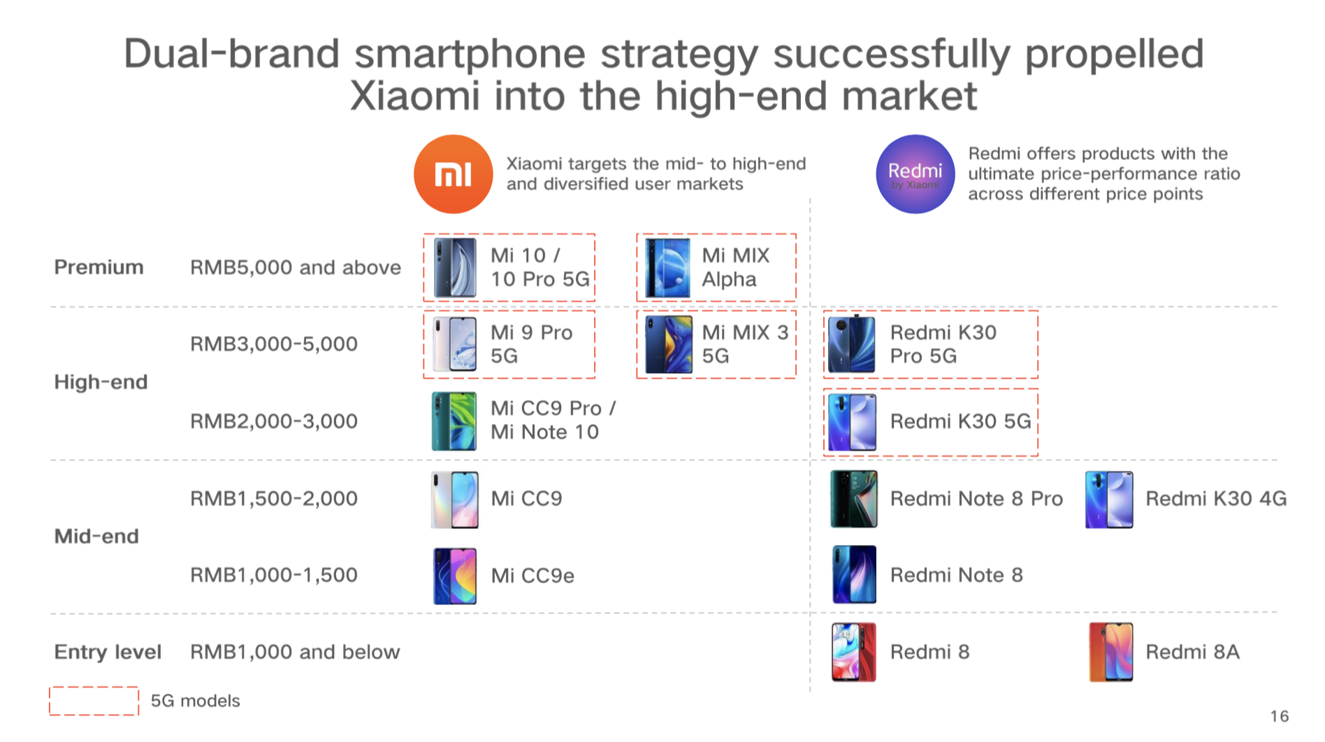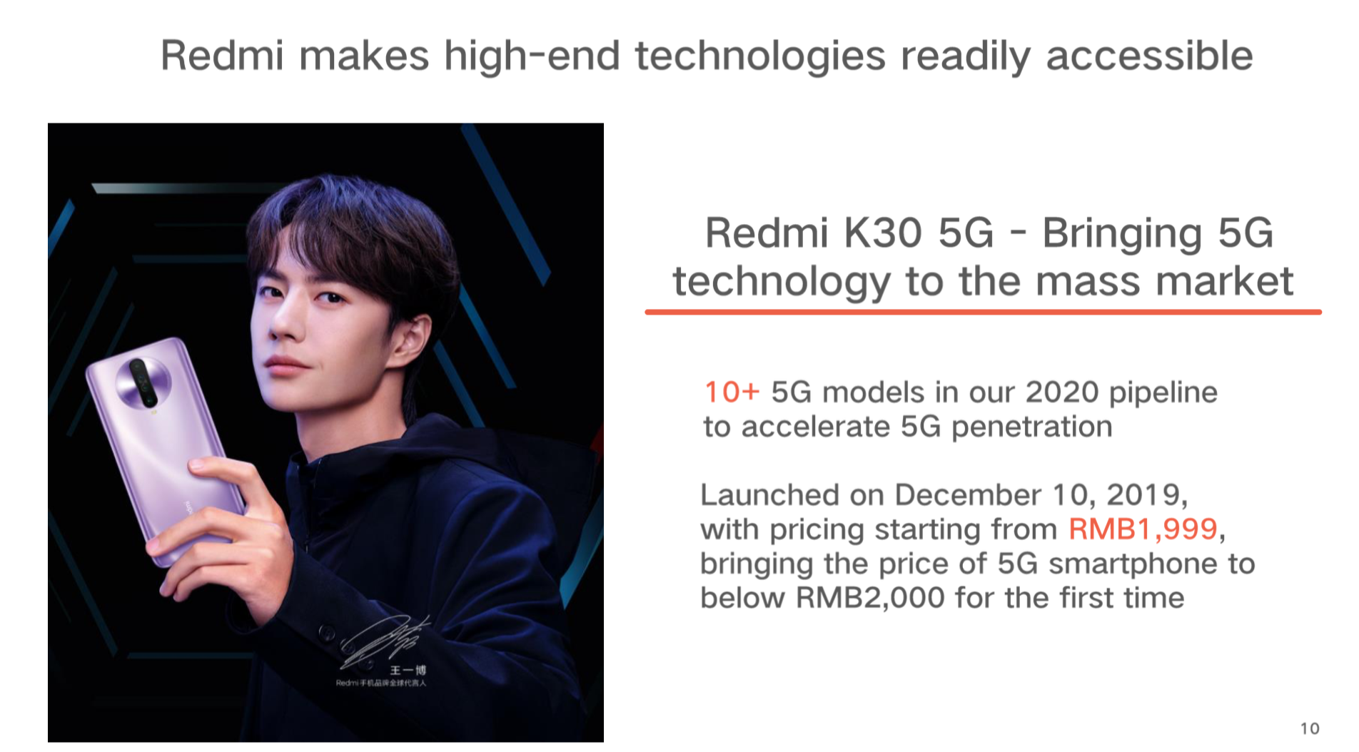 红米的定位是让高端技术大众化,2019年底,公司推出了一款价格仅为1999元的5G手机,加速5G手机的普及。