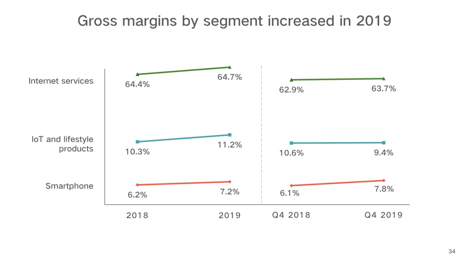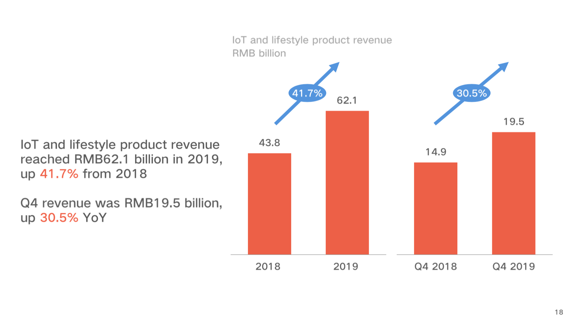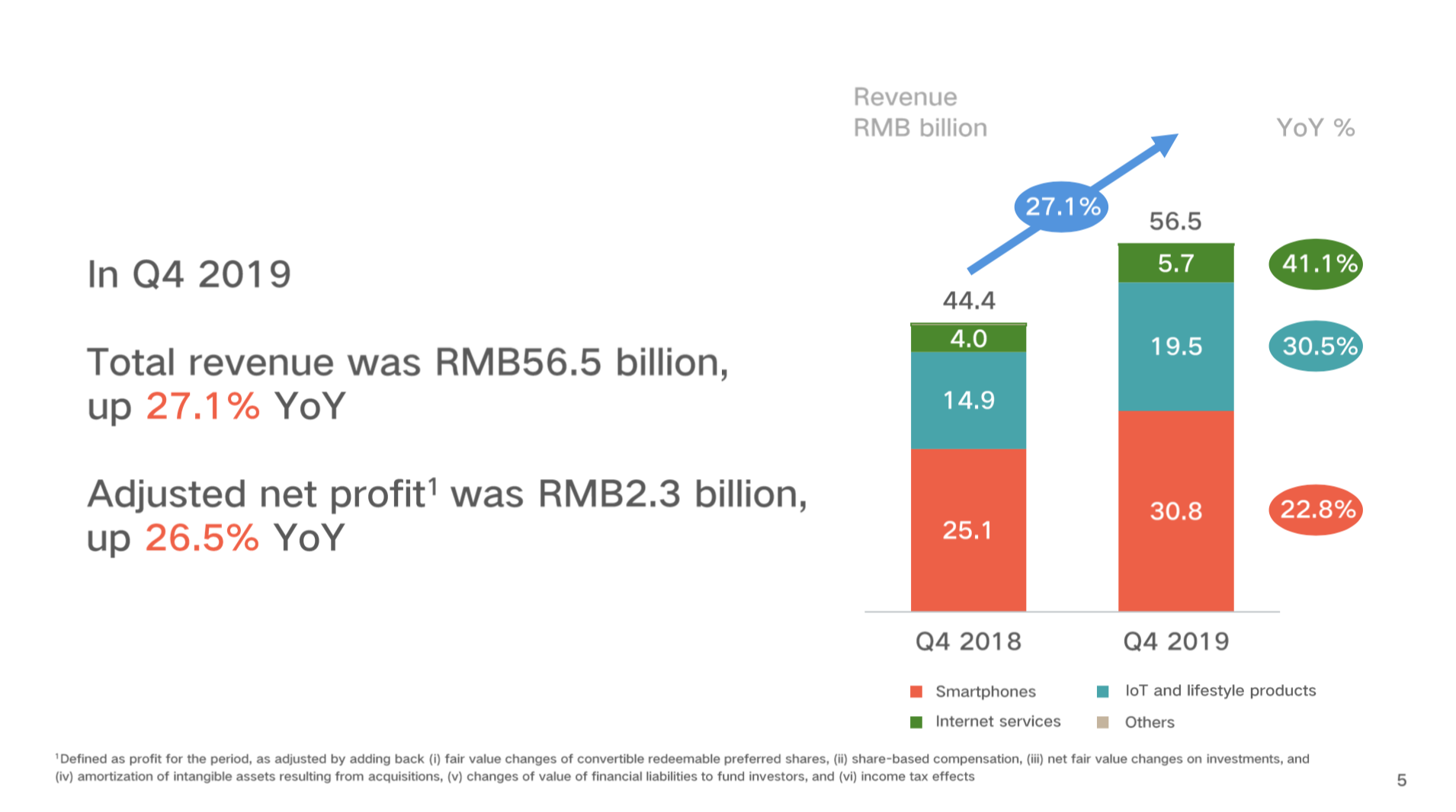 4季度,公司总营收为565亿元,同比增长27.1%,智能手机营收同比增长22.8%,iOT营收同比增长30.5%,互联网服务营收同比增长41.1%,各业务版块均取得显著增长。