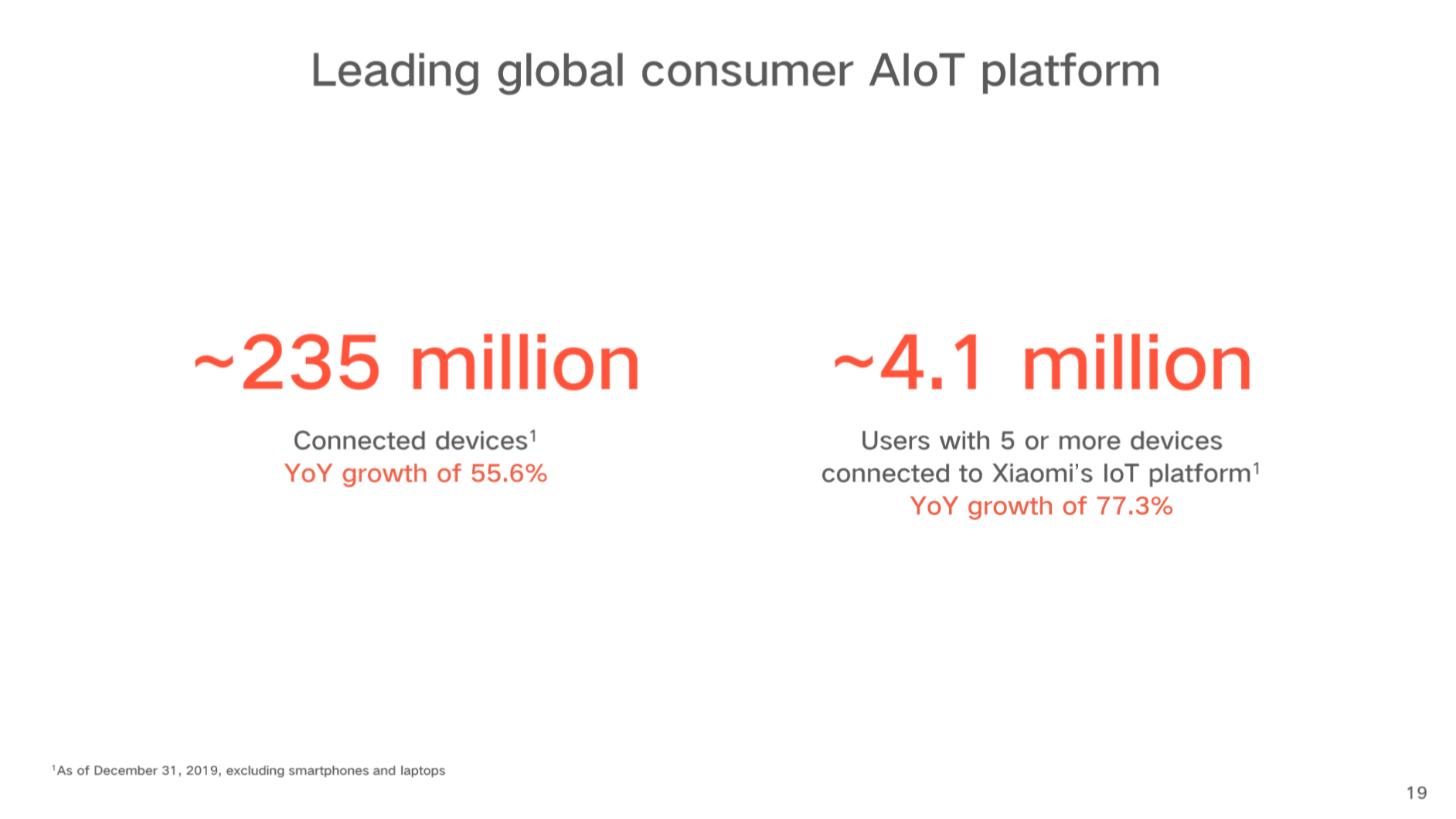 IOT活跃联网设备数达到2.35亿,同比增长55.6%,拥有5个设备以上的用户达到410万人,同比增长77.3%。