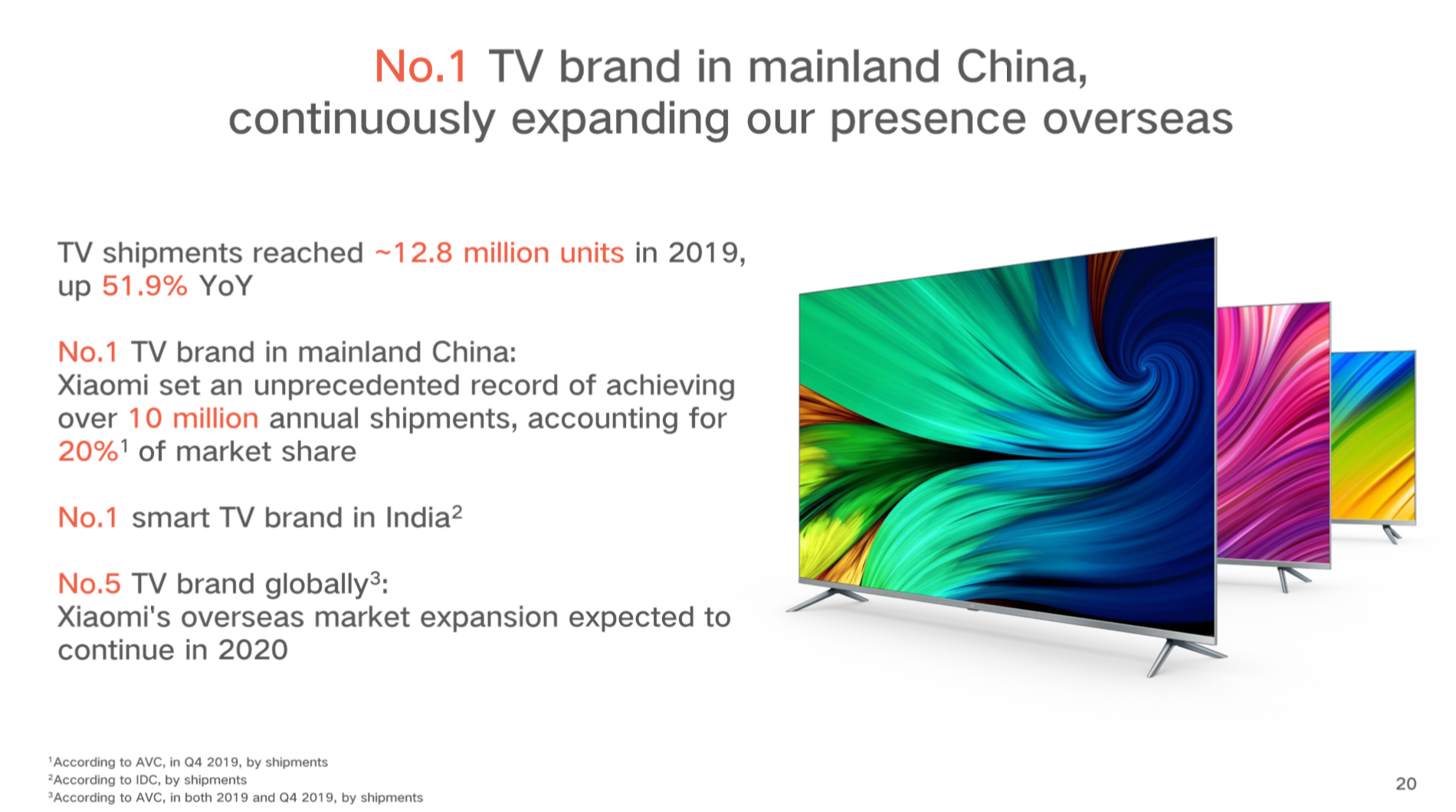 以智能电视为例,目前是中国第一品牌,正在持续扩大海外市场。2019年中国市场小米电视销量达到1000万台。印度市场智能电视第一,全球电视品牌排名第五。
