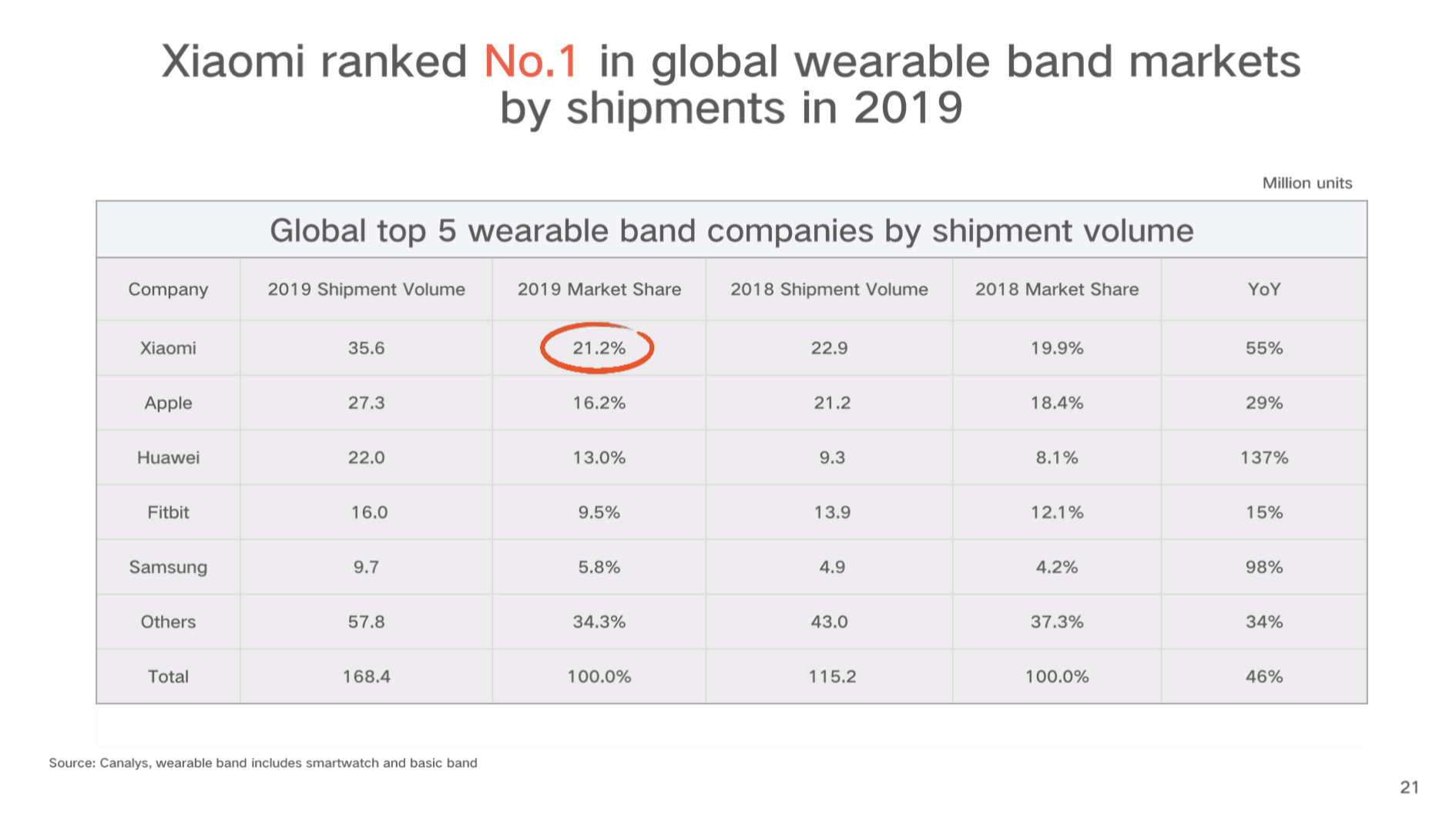 2019年小米全球可穿戴设备出货量排名第一。