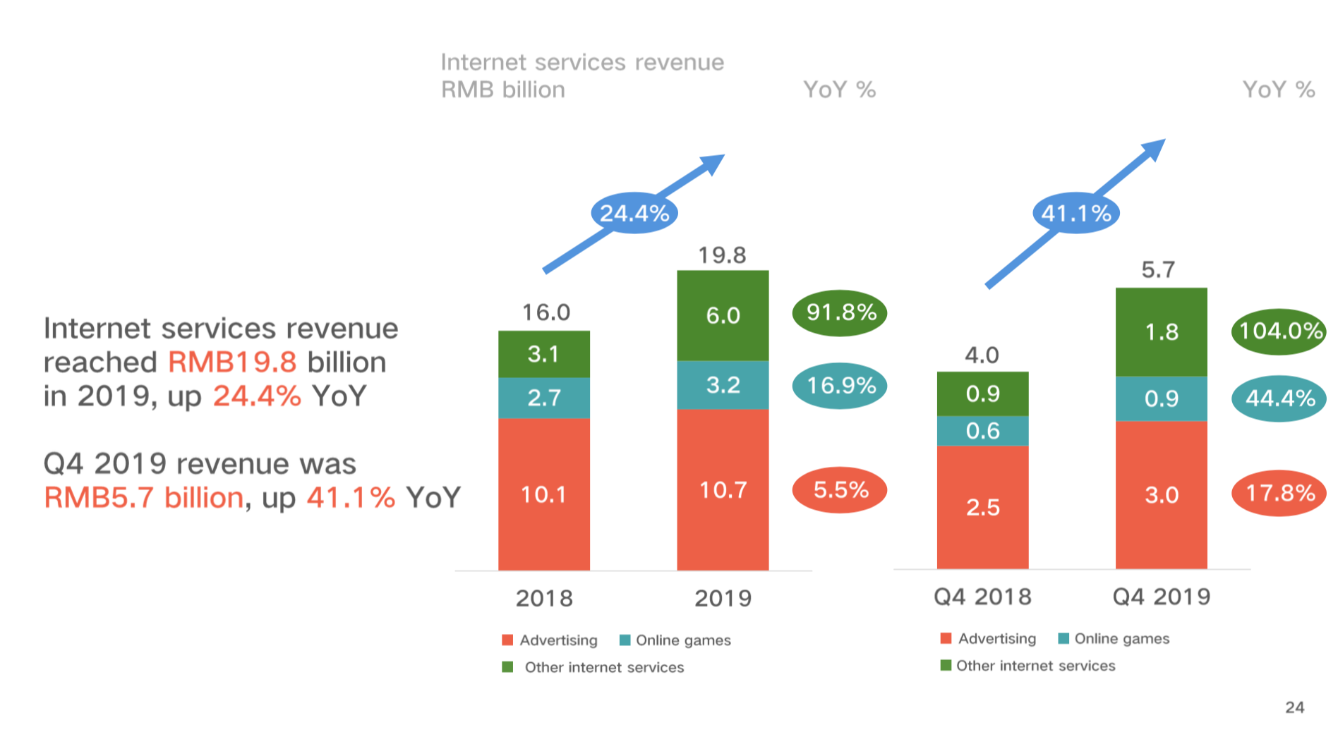 【互联网服务】2019年互联网服务营收同比增长24.4%至198亿元,4季度营收同比增长41.1%至57亿元,其中广告业务同比增长17.8%,在线游戏同比增长44.4%,其他互联网服务同比增长104%。