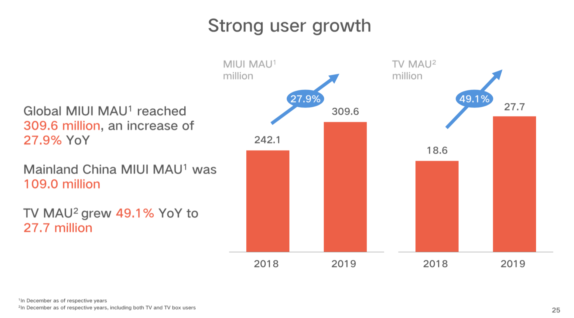 互联网营收业务的增长动力来自于用户的强劲增长,全球MIUI 月活跃用户数达到3.096亿人,同比增长27.9%,中国大陆MAU达到1.09亿人,电视MAU达到2770万人,同比增长49%。