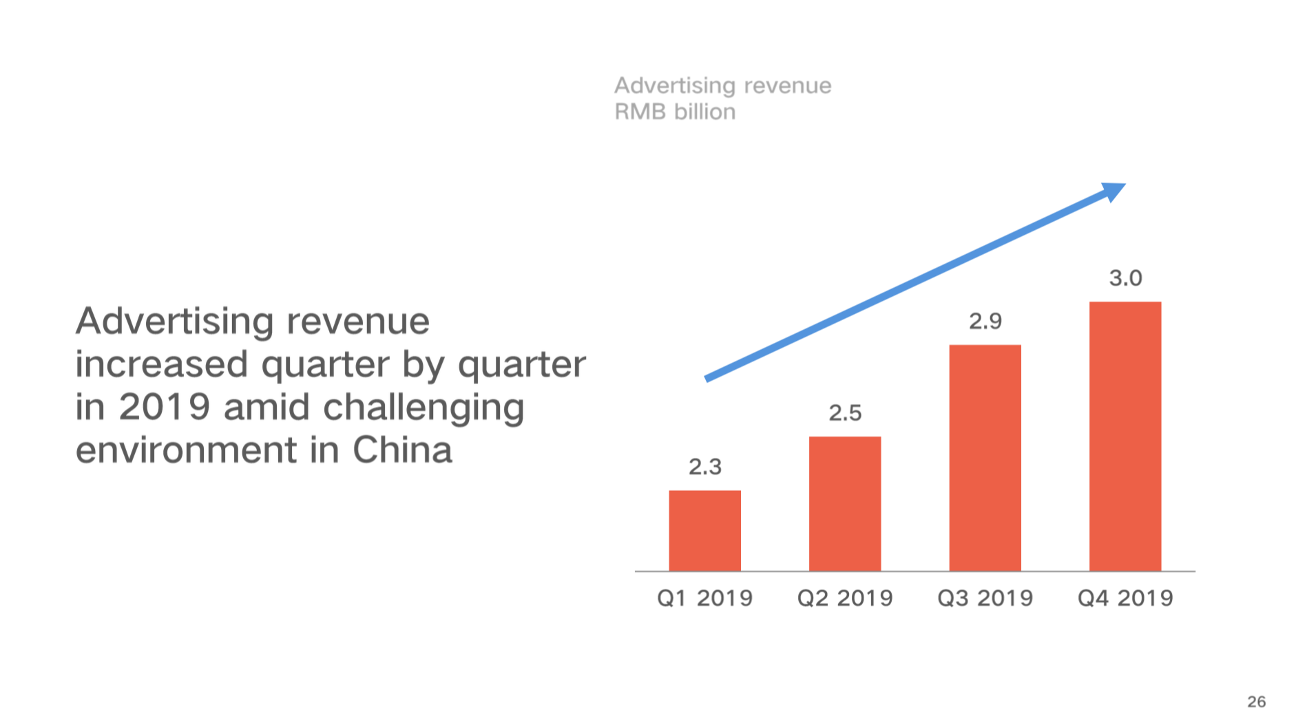 在中国市场面临挑战的环境下,整体广告营收季度比季度实现增长。