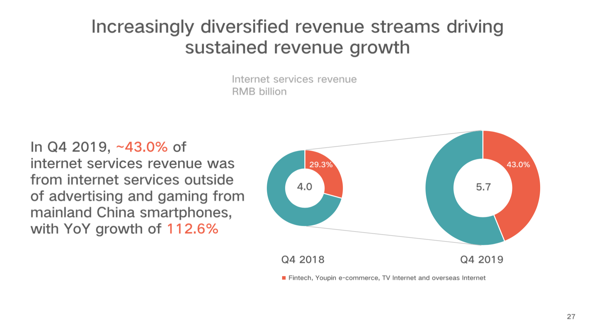 公司日趋多元化的营收来源使得互联网营收持续增长。4Q 43%的互联网营收来自中国市场的广告和游戏之外,年比年增长112.6%。
