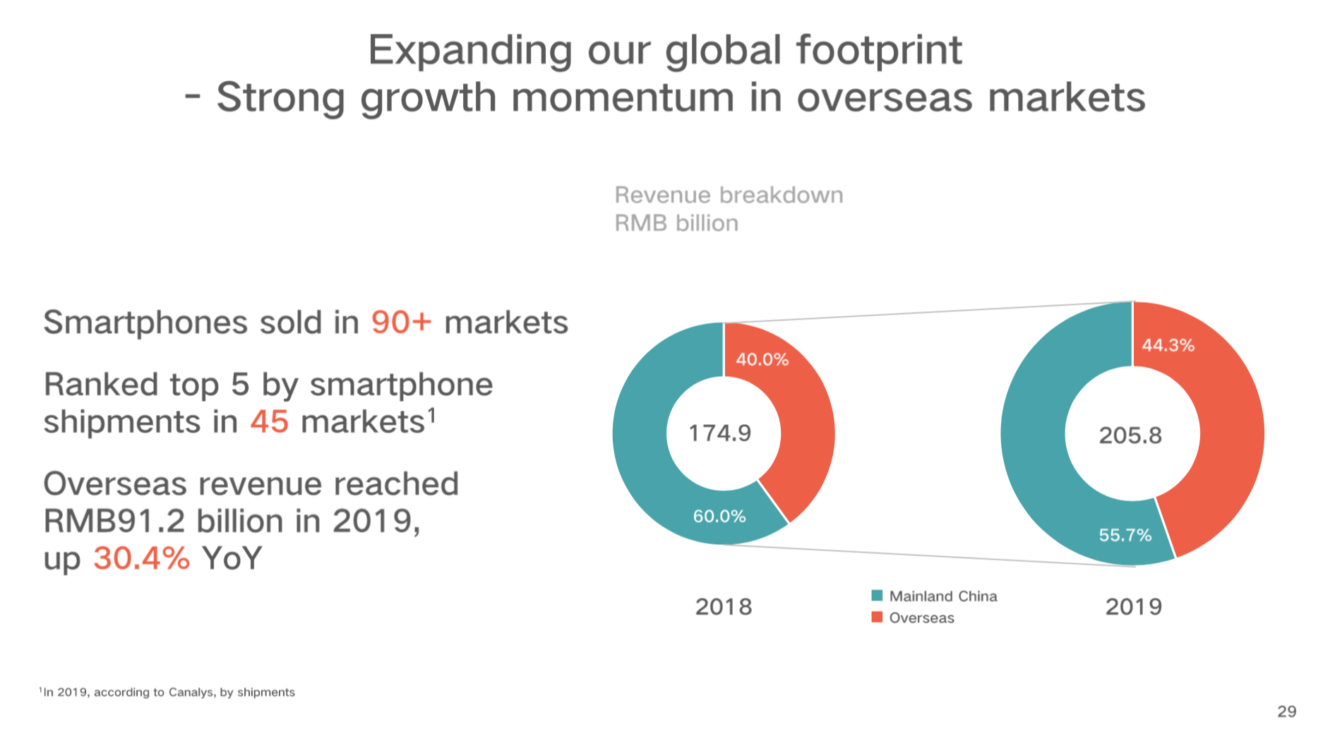 【海外市场】公司持续扩张海外智能手机市场,智能手机已经进入90个市场,在45个市场中排名前五,2019年海外市场营收达到912亿元,同比增长30.4%。
