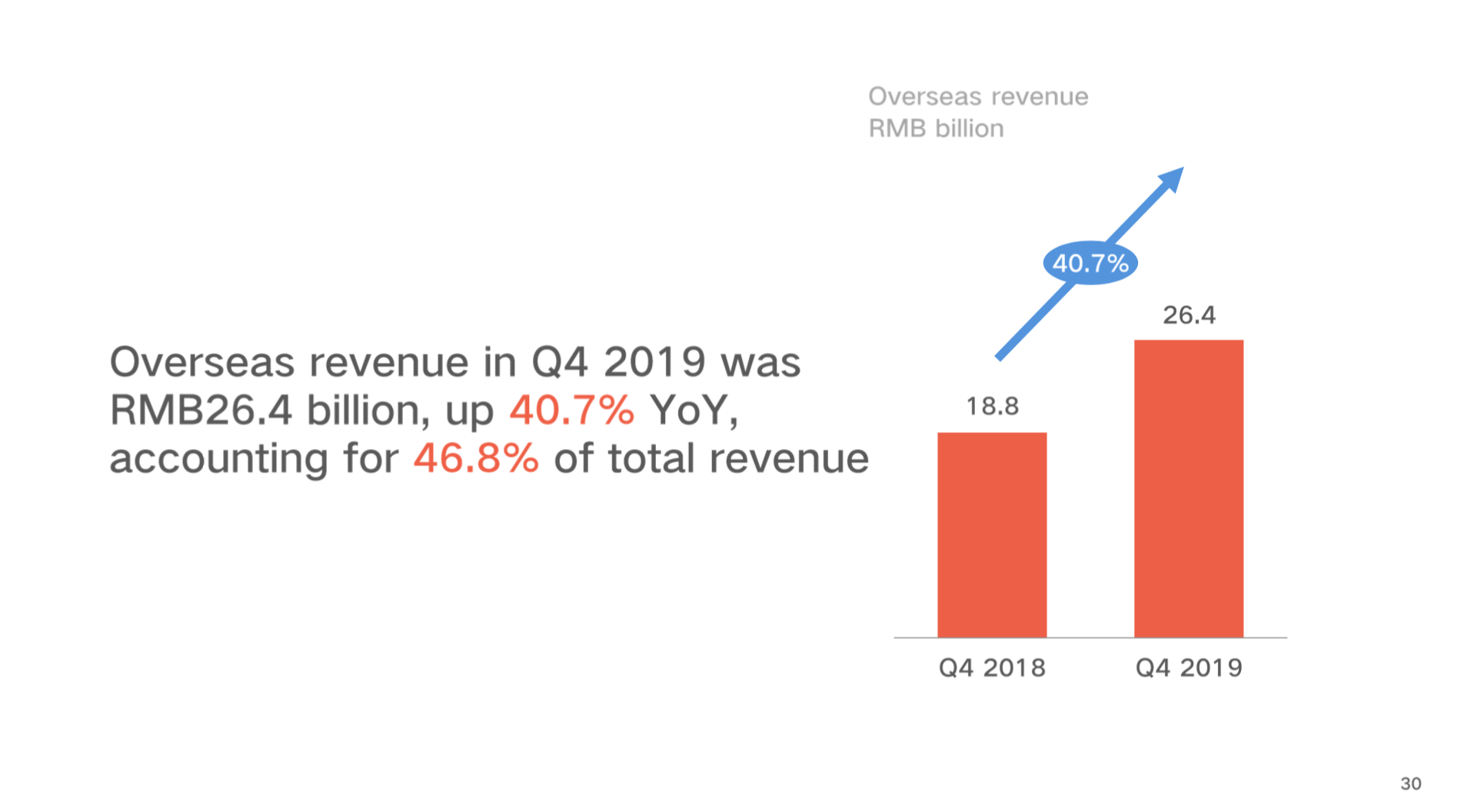 4Q 海外市场营收为264亿元,同比增长40.7%,占整体营收的46.8%。