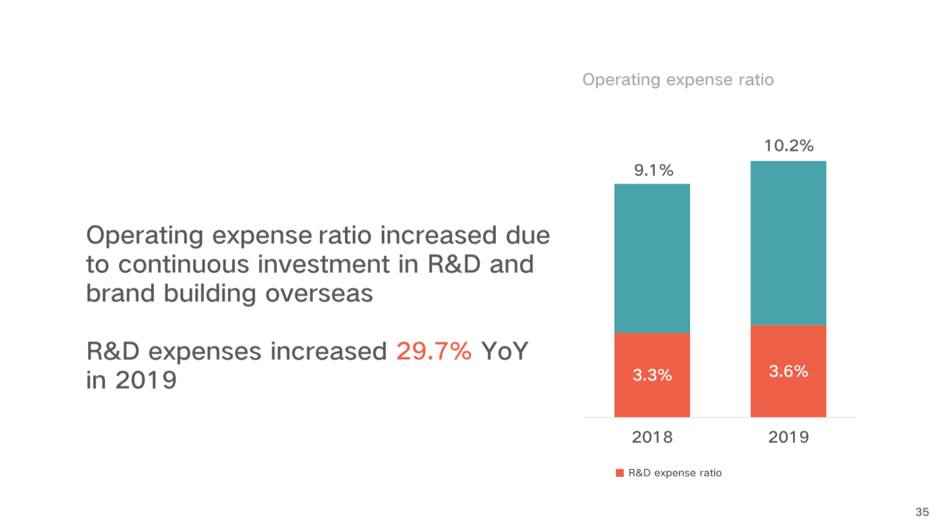 运营费用占营收的比重从2018年的9.1%上升至10.2%,其中研发费用从3.3%上升至3.6%。