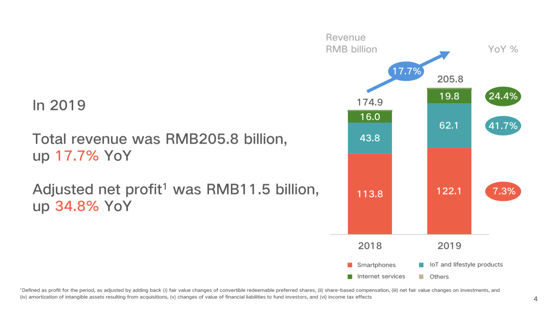 根据小米发布的2019年财报,2019年公司营收同比增长18%至2058亿元,调整后净利润为115亿元,同比增长34.8%。IOT、互联网业务增长强劲,海外市场扩张取得成效,显著驱动了业绩的增长。