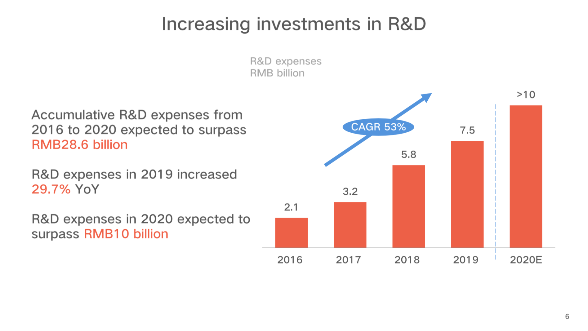 公司在研发方面持续保持较大投入,2019年整个研发投入为75亿元,预计2020年将超过100亿元。