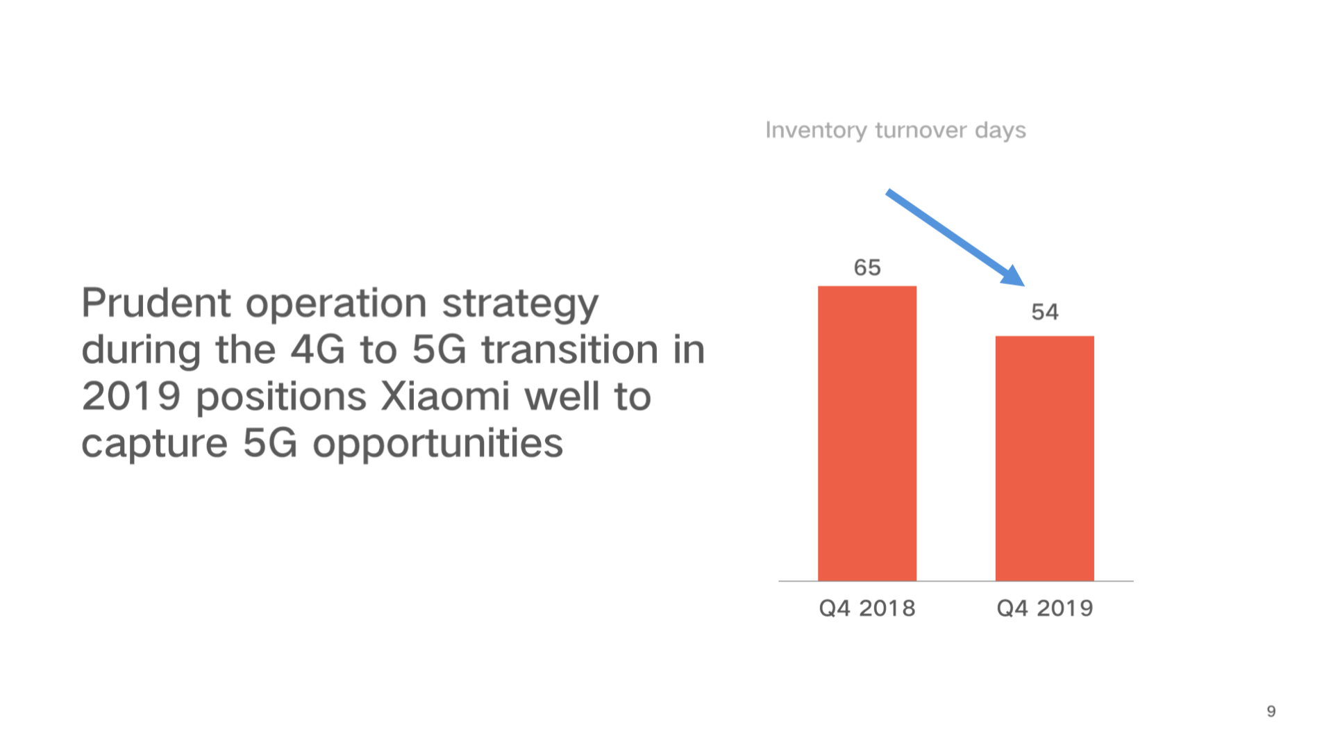 公司加快向5G迈进,采取谨慎的运营策略降低手机库存,库存周转天数从65天下降至54天,从而使得公司可以在迈向5G时轻装上阵。