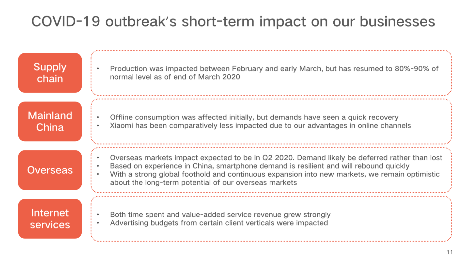 新冠疫情爆发对公司的影响:国内供应链已经恢复,3月份产能恢复至80-90%。在国内消费端,线下渠道影响较明显,但需求在快速反弹,得益于线上渠道优势,小米受到的影响相对同行影响较小。国际市场看,预计2Q会受到影响,手机需求会延迟,根据中国市场的经验,公司对海外市场的长期增长潜力保持乐观。