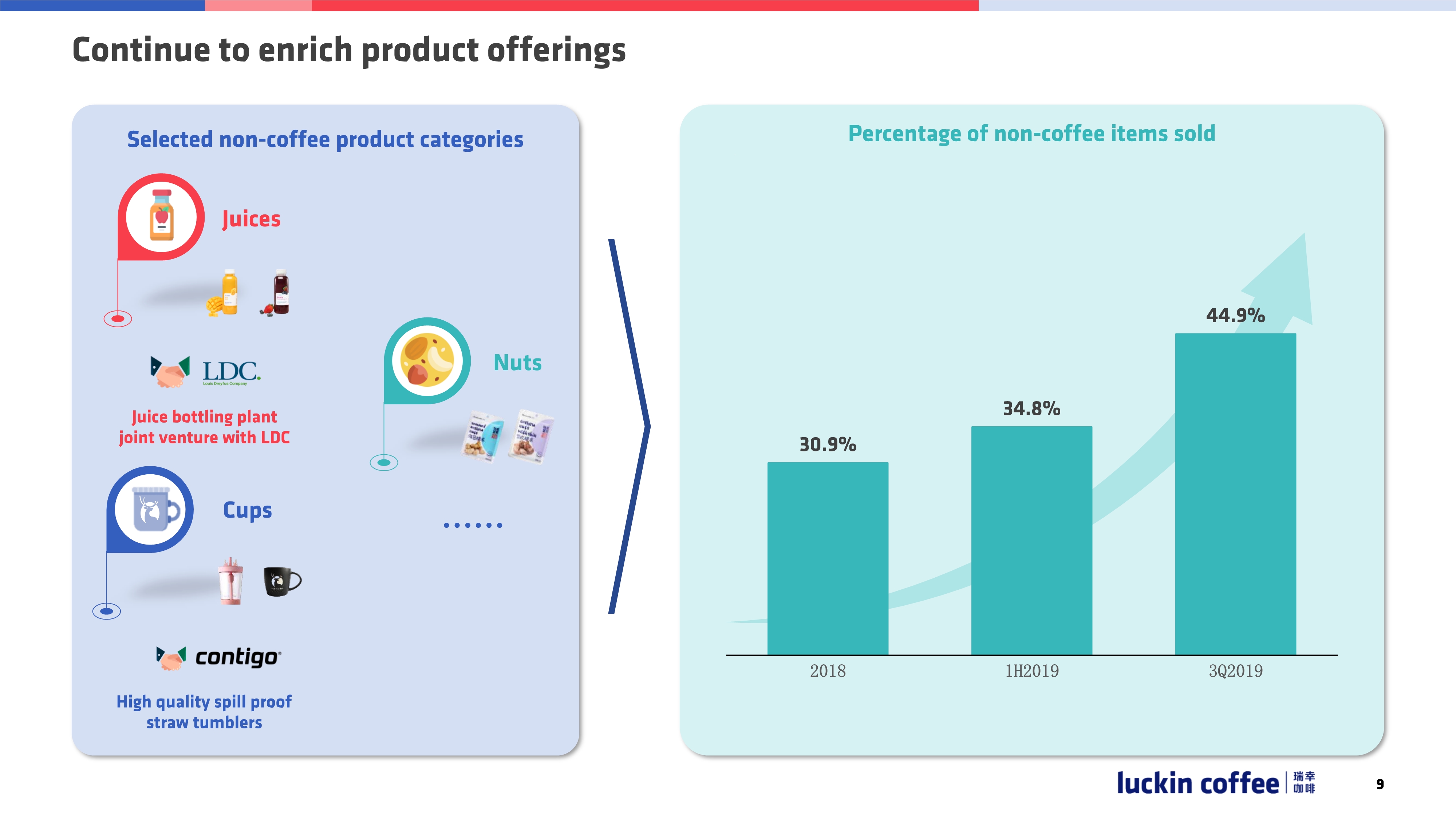 回到咖啡店,公司不再只是卖咖啡了,还卖很多非咖啡产品。非咖啡收入从31%增加到45%,本季度推出了咖啡周边,如杯子,跟LDC合作将推出果汁,以及坚果产品等。